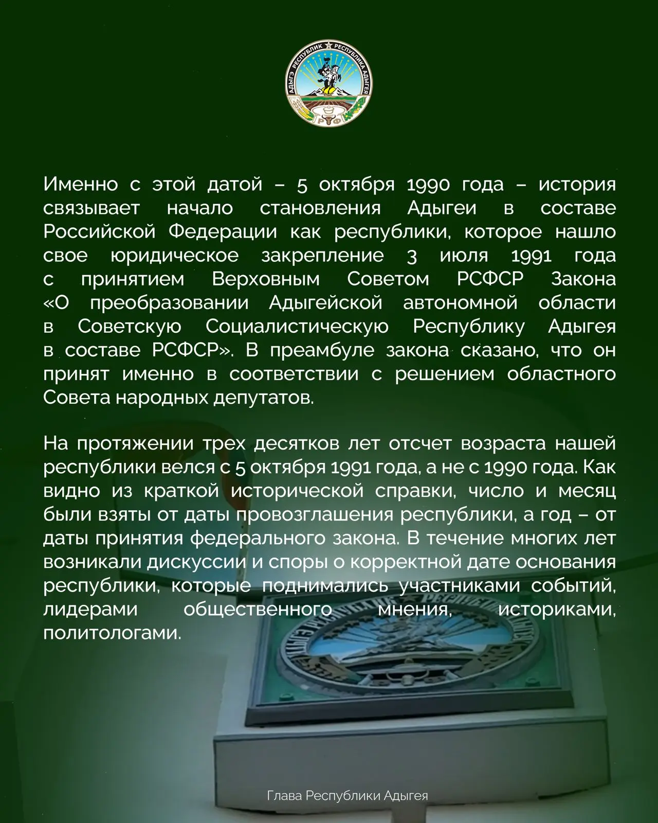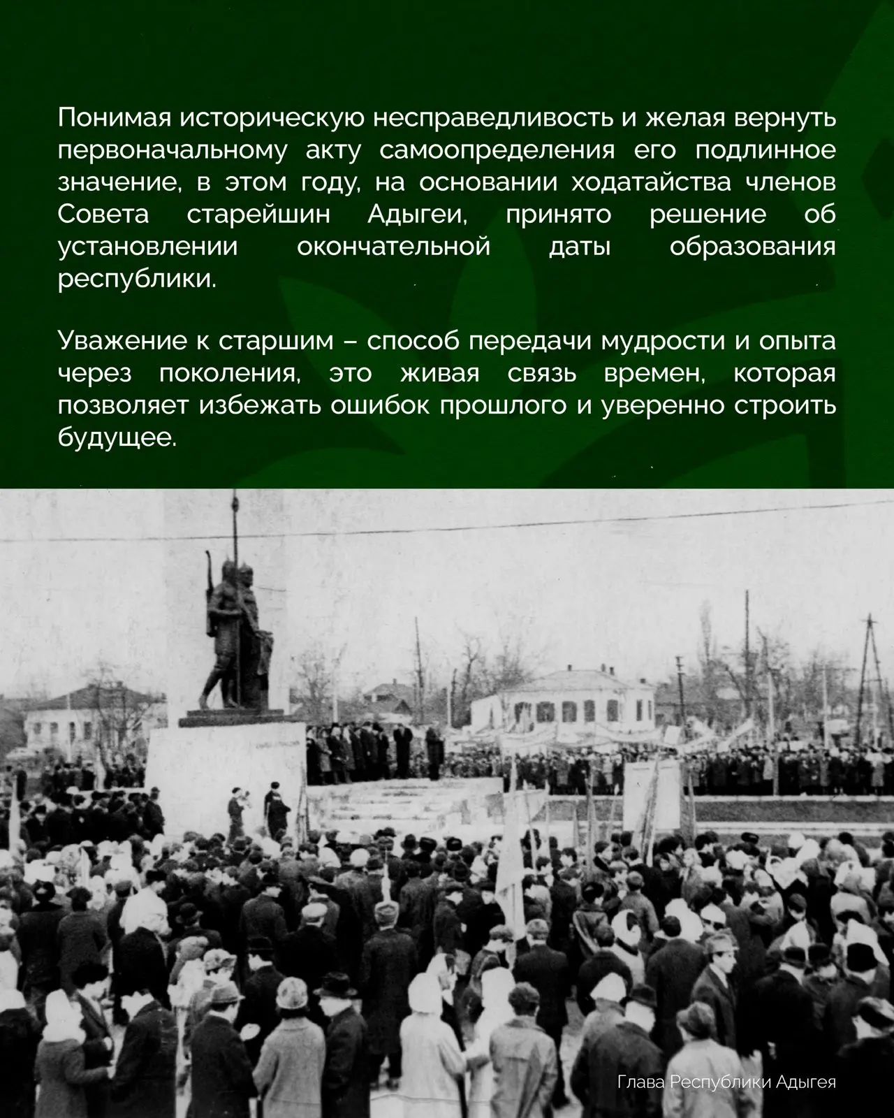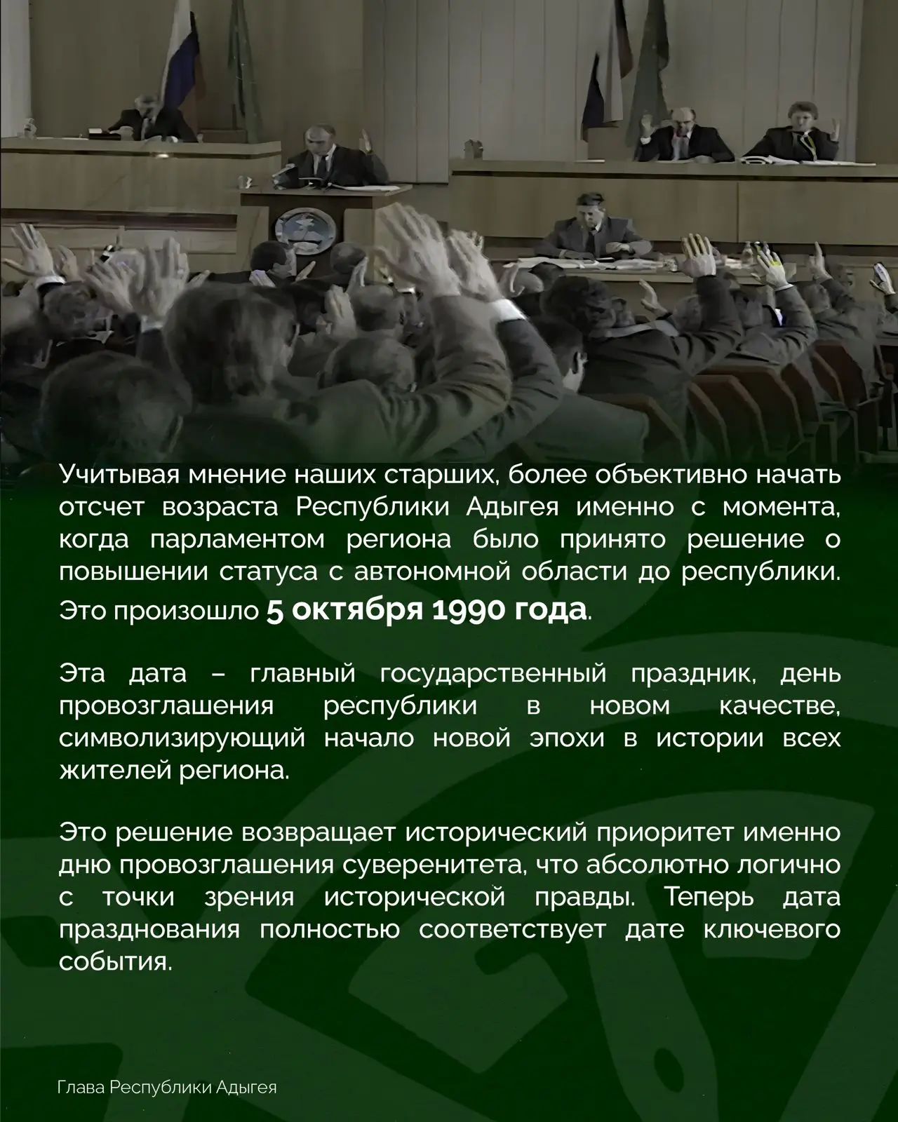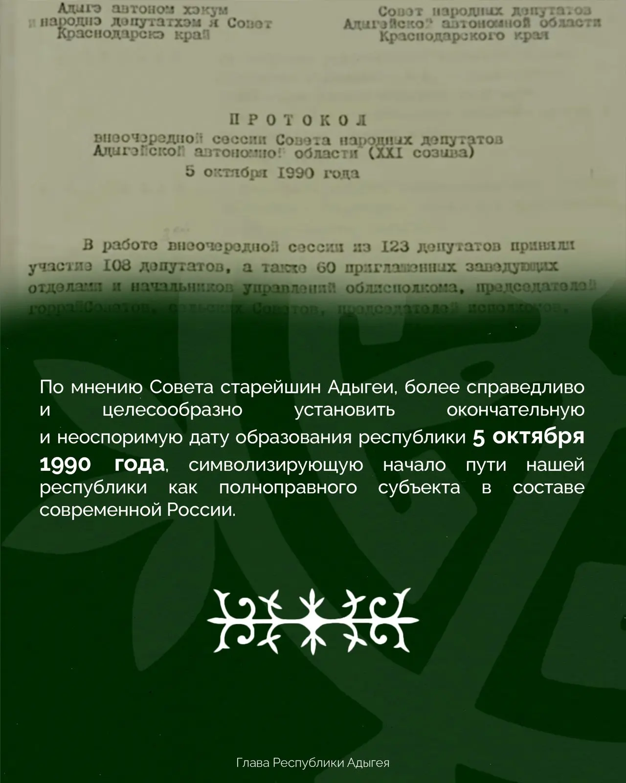 По инициативе наших старших – Совета старейшин Республики Адыгея – мы уточнили дату, с которой принято вести отсчёт возраста Адыгеи в статусе республики. В карточках – история вопроса и выводы.