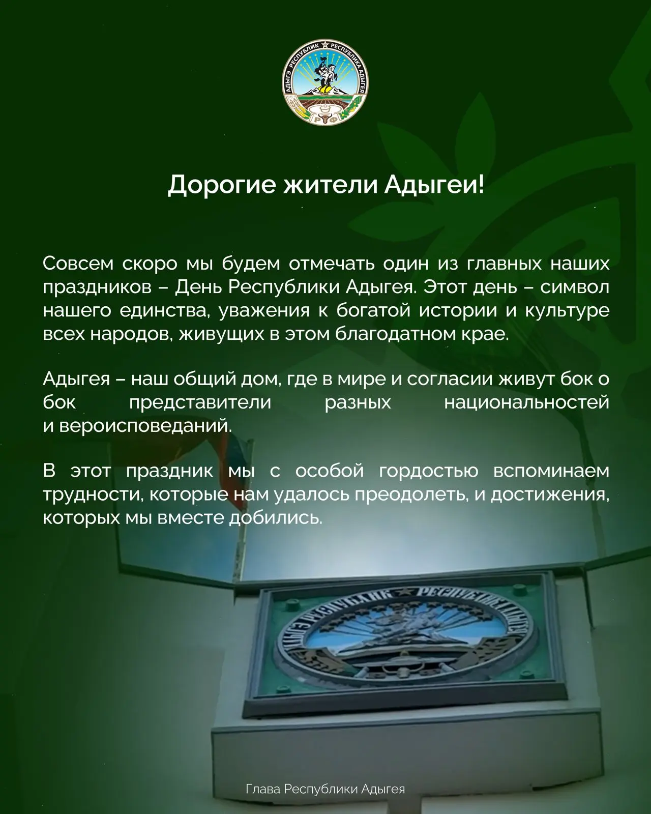 Дорогие жители Адыгеи! От всей души поздравляю вас с Днём республики!