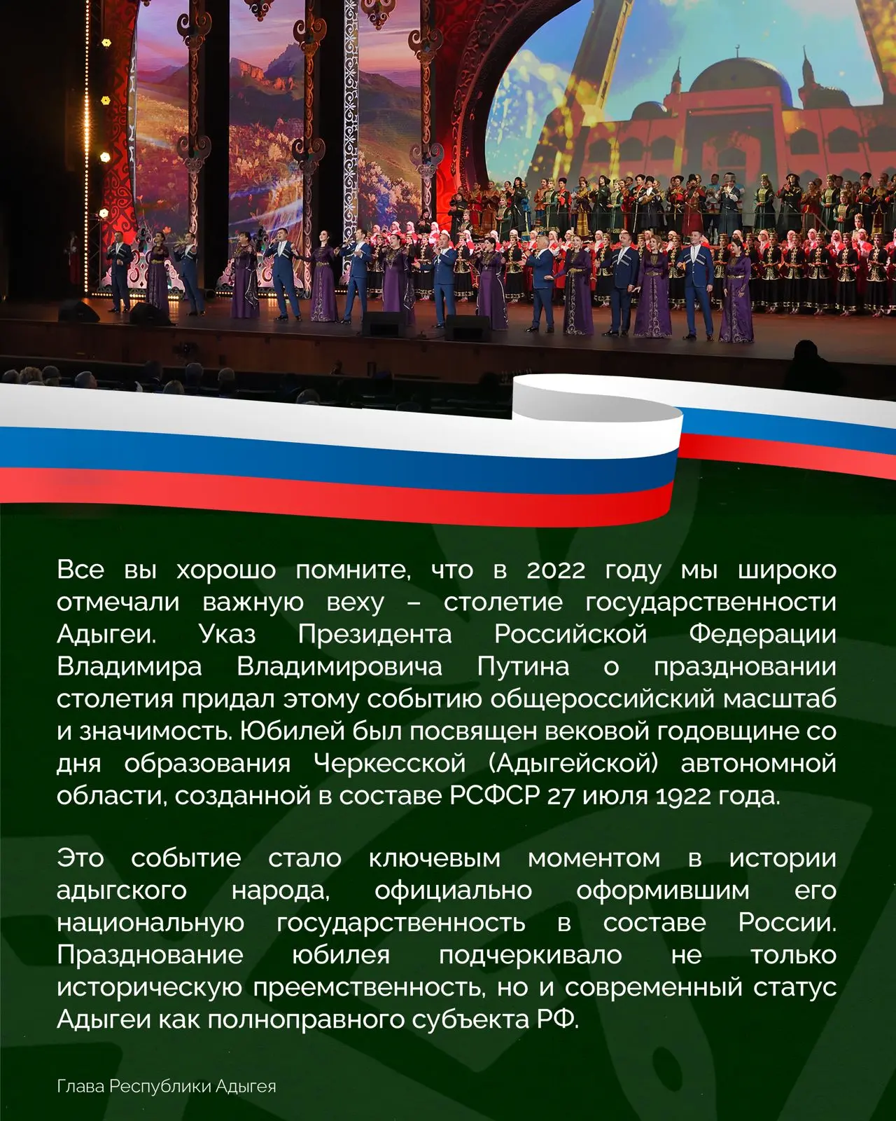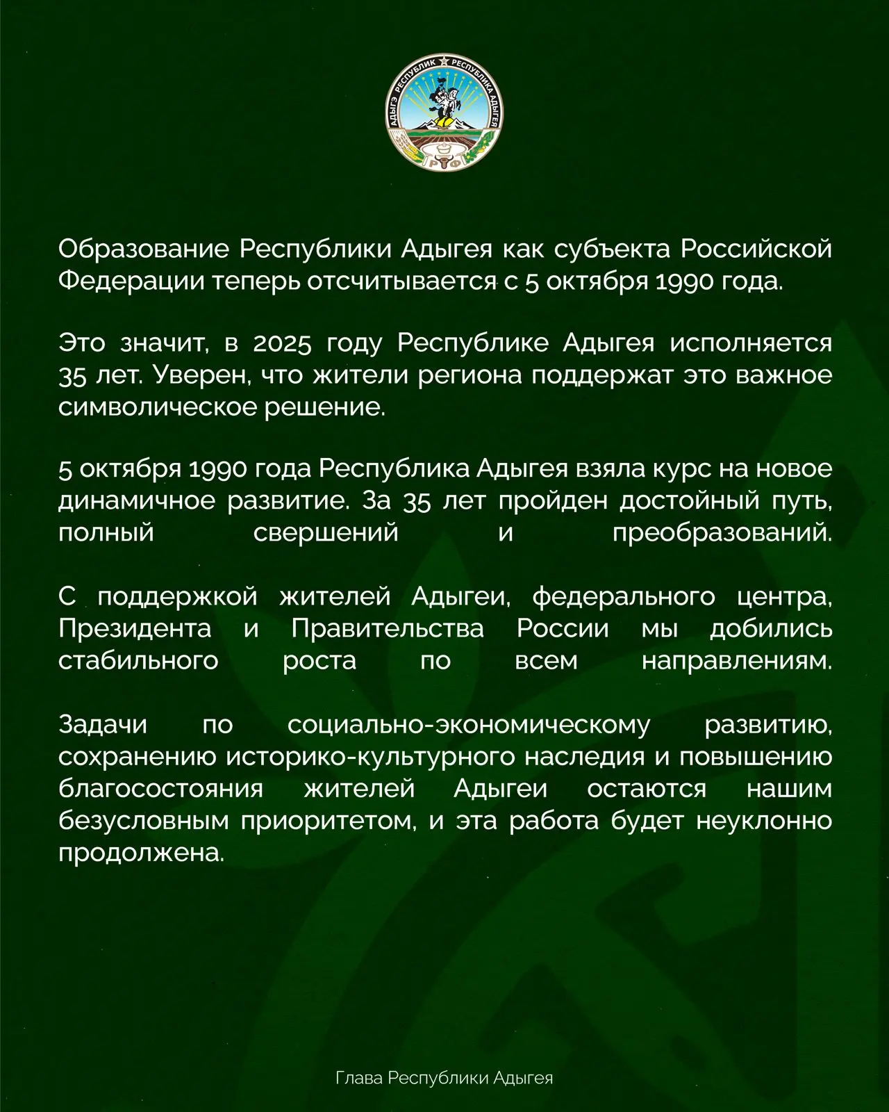 Сегодня нашей любимой Адыгее исполняется 35 лет. За эти годы республика прошла насыщенный путь развития, и сегодня мы с уверенностью можем говорить о больших достижениях: укрепились позиции региона в экономике, выстроена и совершенствуется социальная инфраструктура, государственные услуги становятся год от года более удобными и доступными, формируется комфортная среда для жизни как в городах, так и в сёлах.
