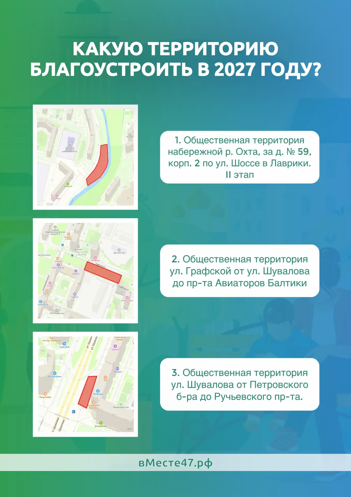 На портале «вМесте47.рф» жители, достигшие 14-летнего возраста, могут отдать свой голос за понравившуюся территории.