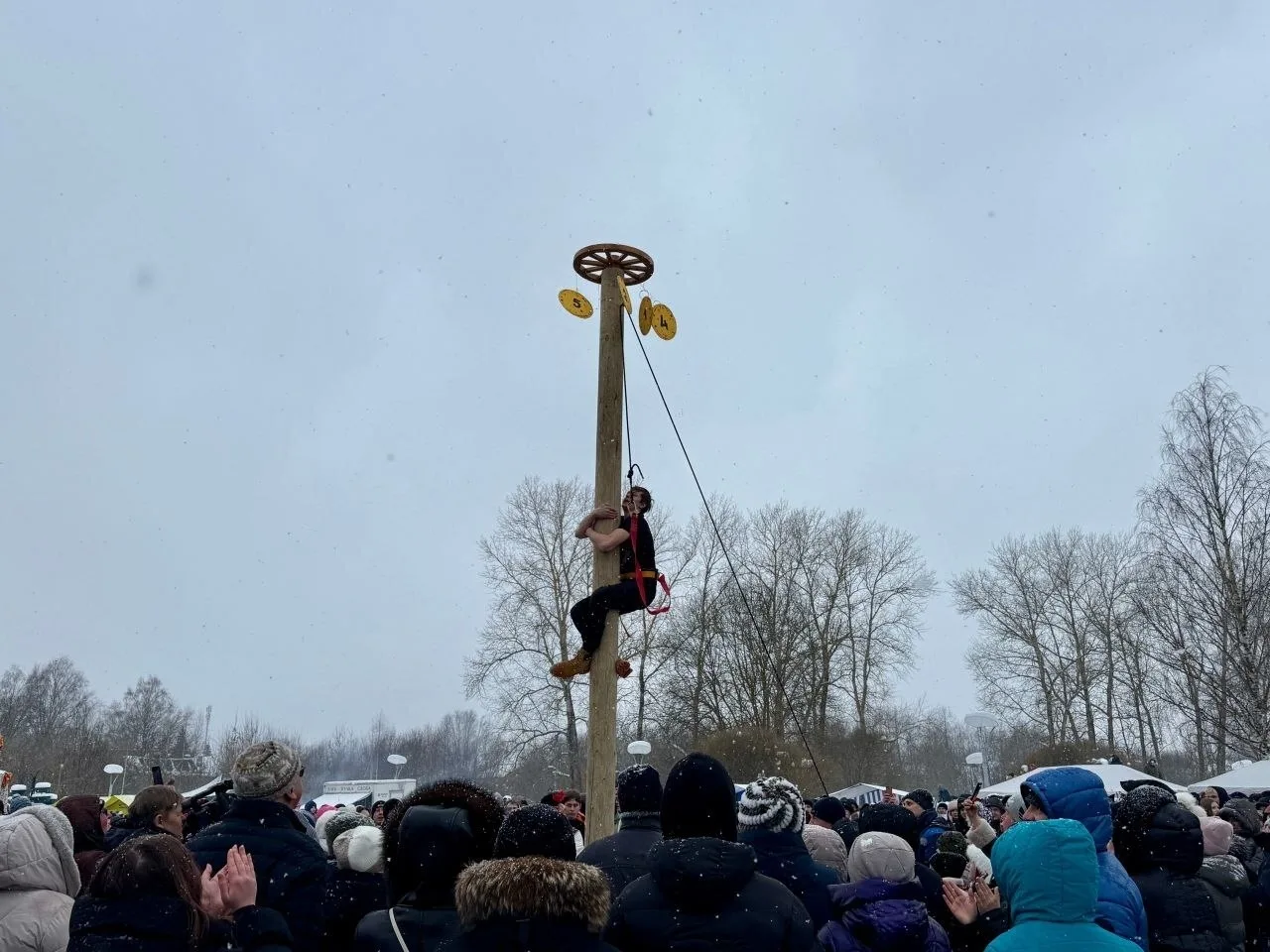 Самая популярная забава на Масленице — покорение деревянного столба. Его высота несколько метров, а на вершине — приз.