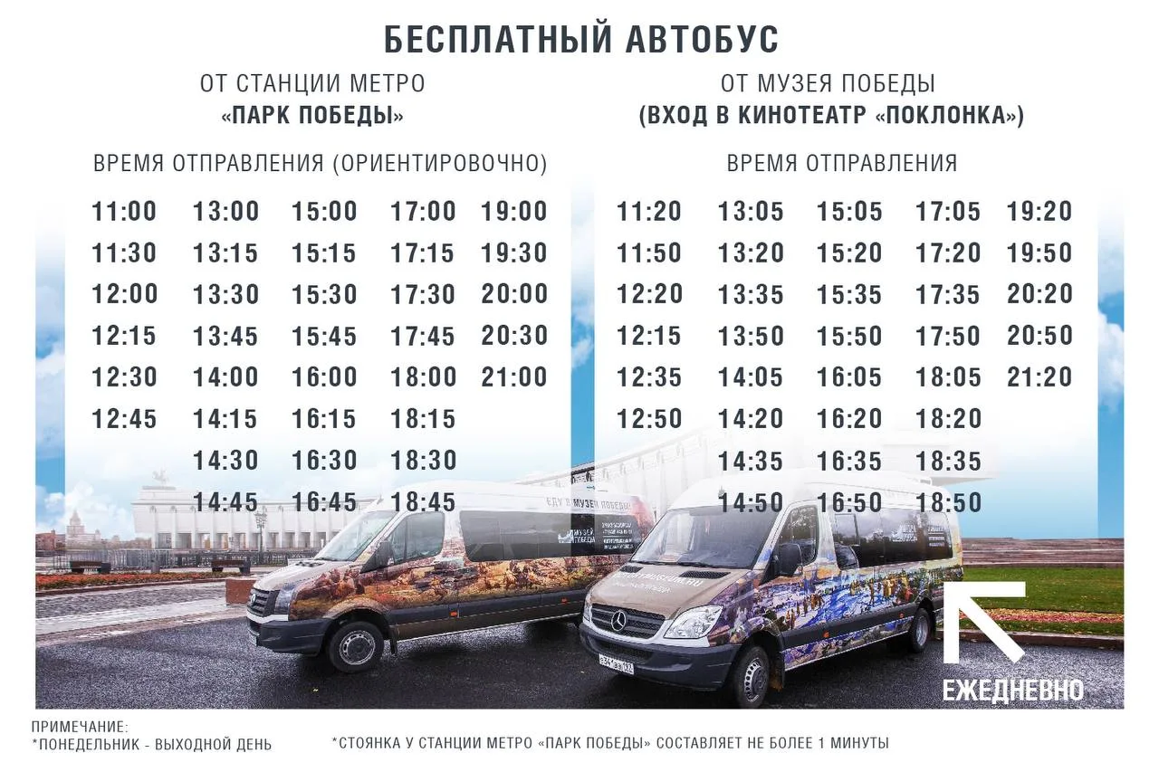 Брендированные автобусы курсируют ежедневно с 11:00 до 21:00 от станции метро «Парк Победы». Найти их можно легко по фирменному логотипу «Еду в Музей Победы!» и изображениям диорамного комплекса.