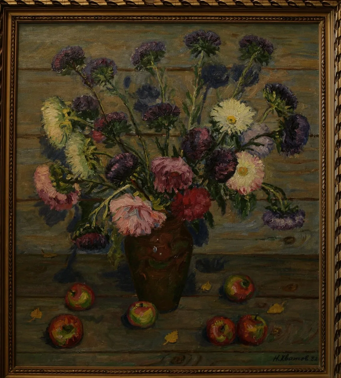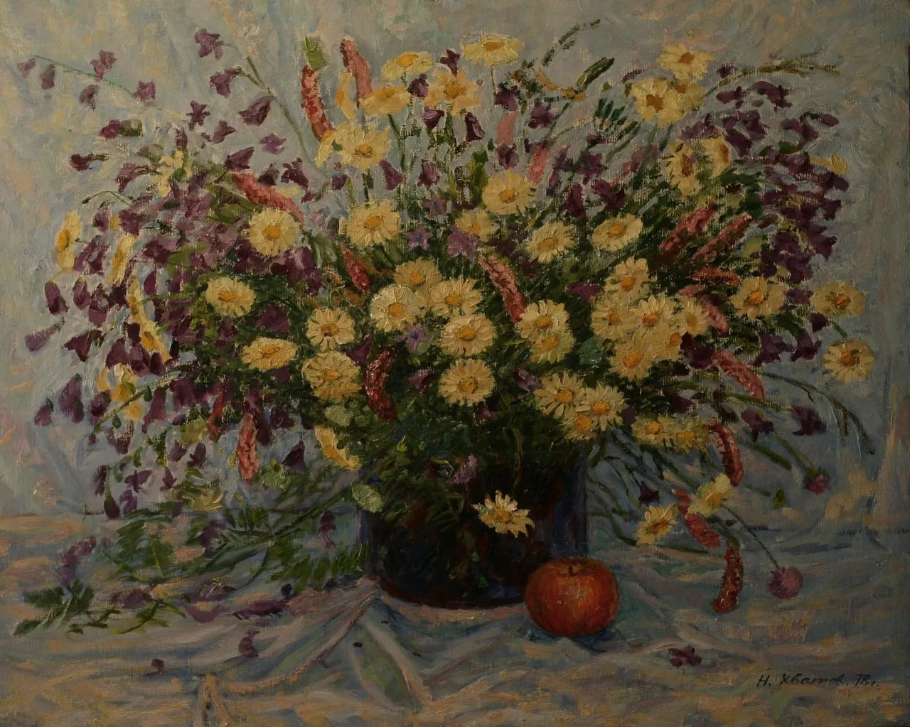 Его натюрморт «Цветы» — жизнерадостная композиция, в которой букет садовых цветов в глиняной вазе уравновешен лежащими на столе яблоками. Работа передает ощущение домашнего уюта и летнего изобилия. Цветы символизируют красоту и мимолетность природы, а яблоки — плодородие и завершенность природного цикла.