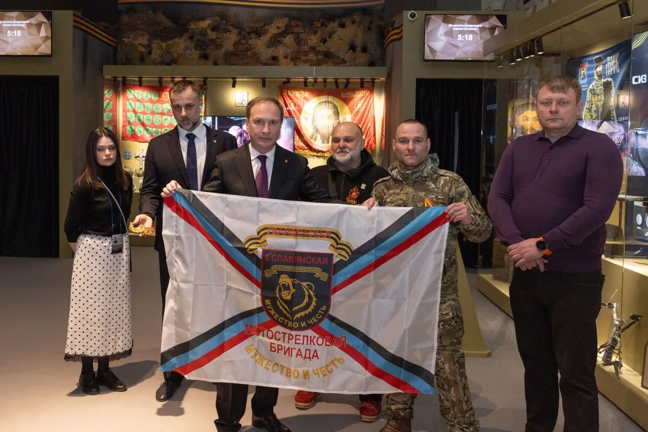Кроме этого, сегодня в Музей Победы передали флаг и шеврон Первой Славянской Гвардейской ордена Суворова ордена Донецкой Народной Республики отдельной мотострелковой бригады, а также вымпел ветеранской организации ОМОН «Беркут».