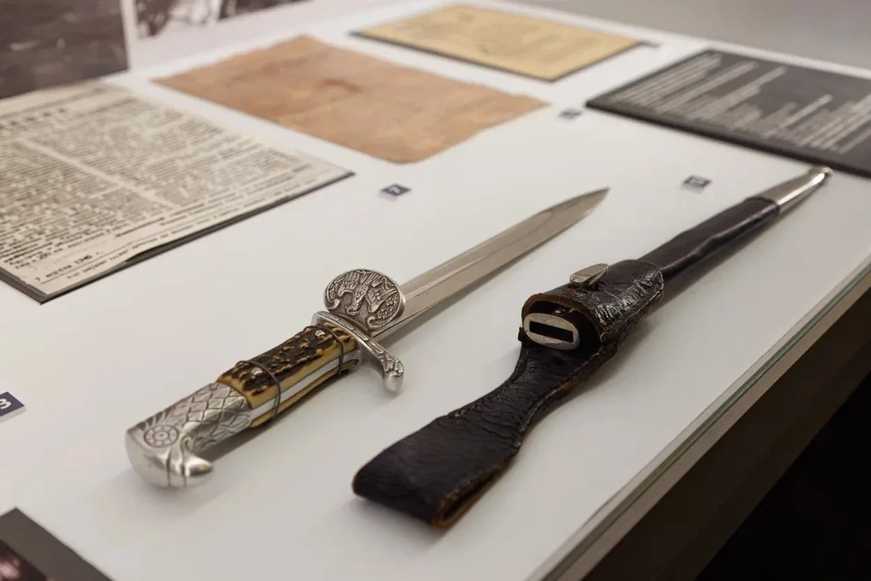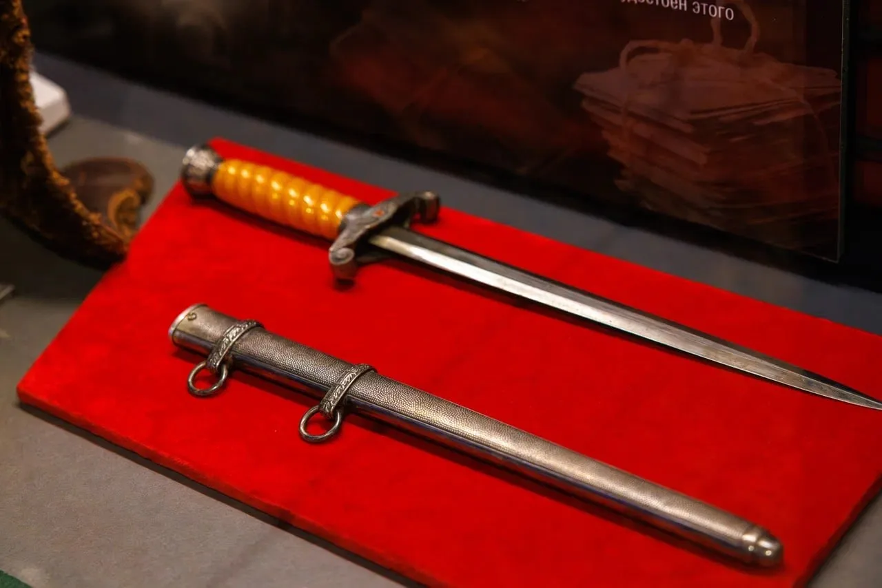 Вы увидите пусковую трубу РПГ Panzerfaus 30, созданную в Германии в 1944-1945 годах, немецкий парадный полицейский штык-нож с ножнами Alexander Coppel Gmbh Solingen, советские листовки «Умей уничтожать вражеских фаустпатронщиков» и «Вперед на штурм Кёнигсберга!», а также благодарность участнику штурма и медаль «За взятие Кёнигсберга».