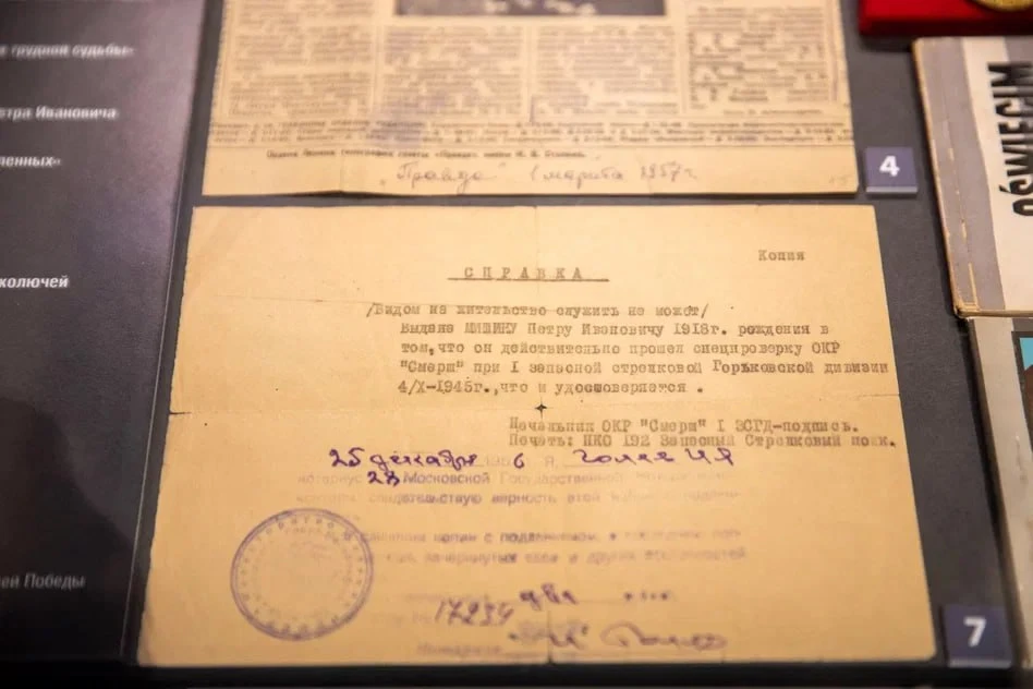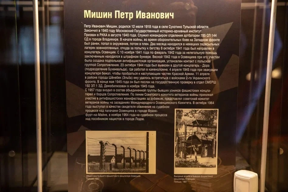 Экспозиция посвящена Петру Мишину, принимавшему участие в оборонительных боях на Западном фронте. Красноармеец был ранен, попал в окружение, несколько лет провел в концлагерях. Сначала — в Освенциме, затем в Бухенвальде.