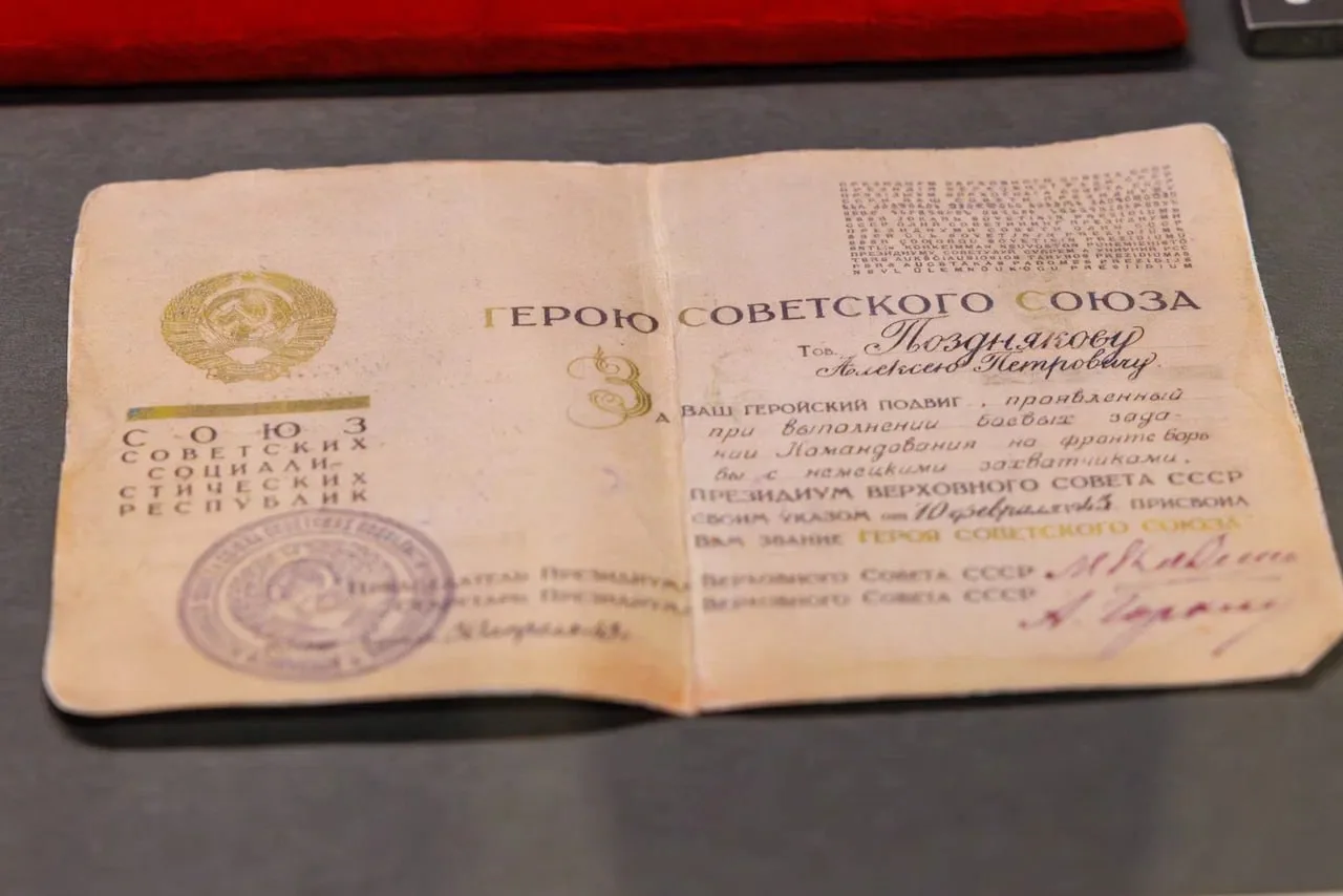 Десять уникальных экспонатов, в том числе медаль «Золотая Звезда», офицерский кортик и летный шлемофон, передал в дар Музею Победы сын фронтовика Петр Поздняков.