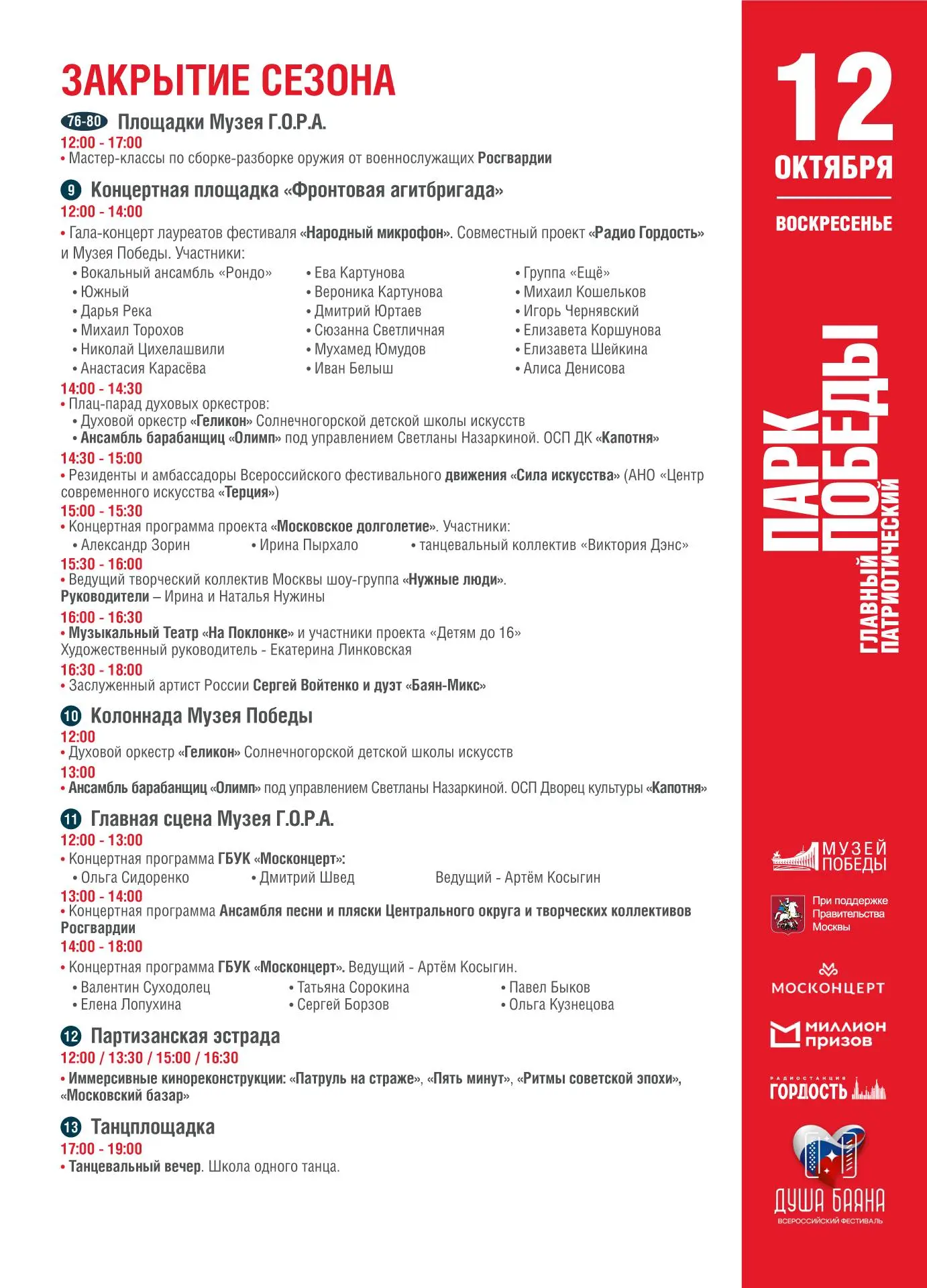 Кроме того, сегодня на «Фронтовой агитбригаде» состоится яркий концерт творческих коллективов «ДК Коммунарка» и артистов «Москонцерта». А на главной сцене Музея Г.О.Р.А. выступят участники Всероссийского фестиваля «Душа баяна» и артисты продюсерского центра Voytenko.pro.