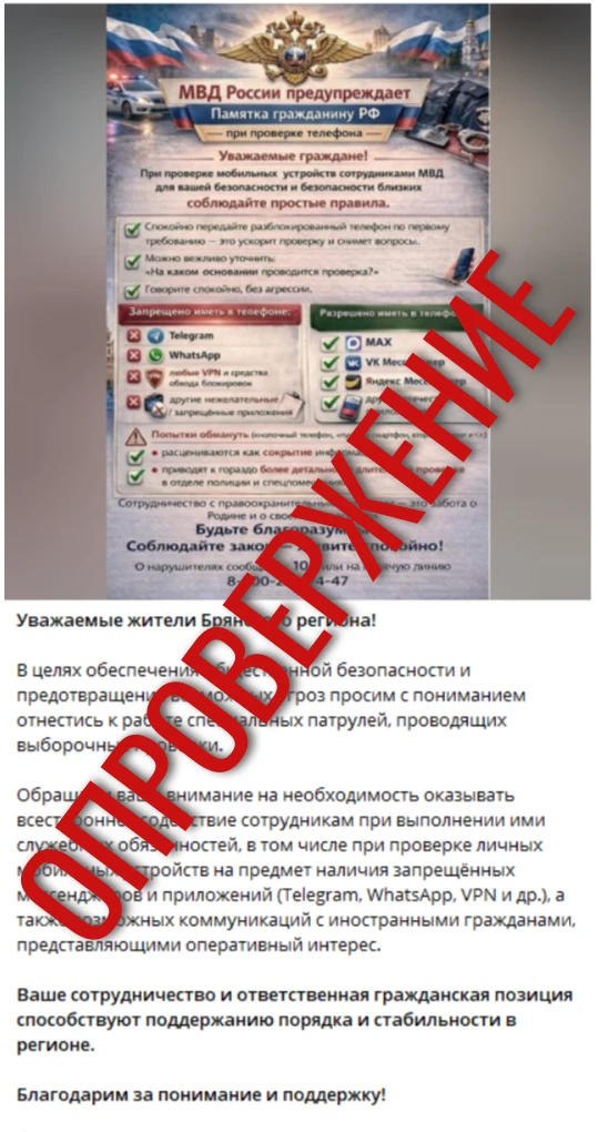 ⚠️ В Брянской области в одном из ТГ-каналов размещена публикация с памяткой о якобы проверке полицейскими личных мобильных устройств на предмет наличия различных мессенджеров и приложений.
