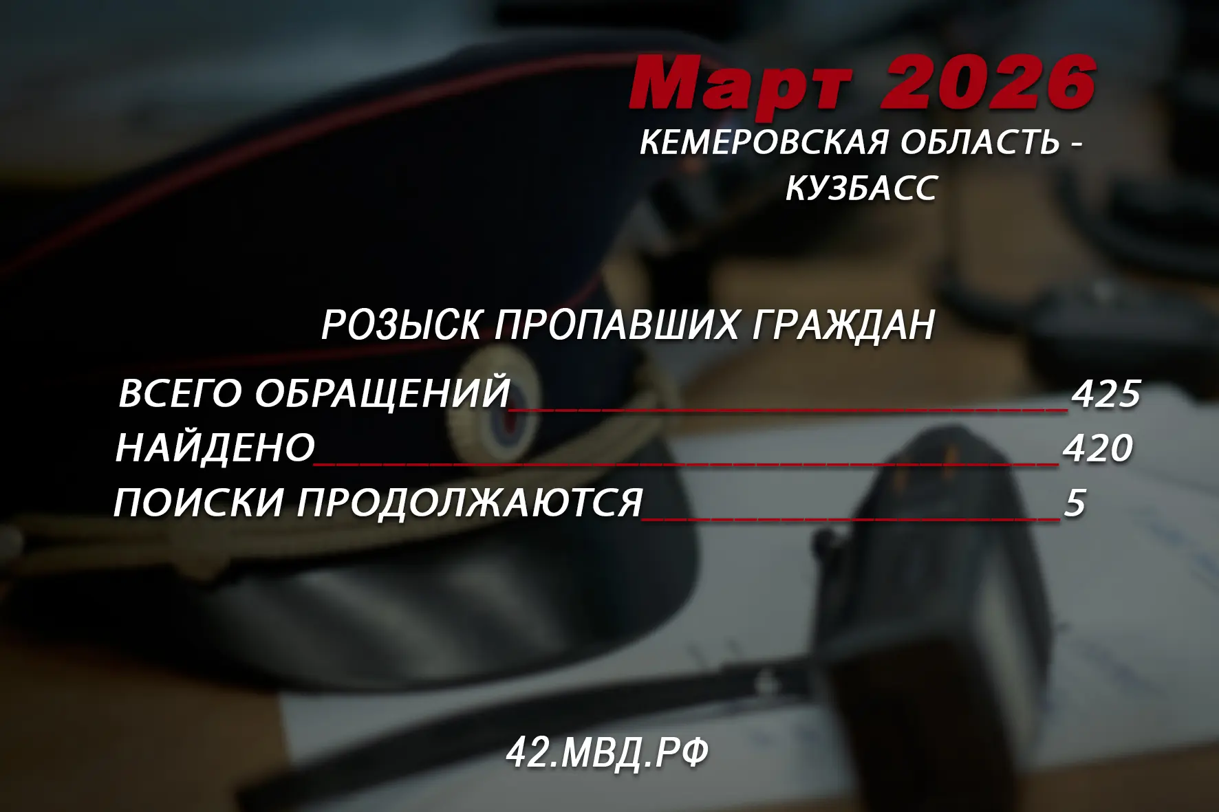 🔍По данным управления уголовного розыска ГУ МВД России по Кемеровской области – Кузбассу, в марте 2026 года в розыске находились 425 человек, 420 из них найдены сотрудниками полиции, в том числе при содействии граждан. Поиски 5 человек продолжаются.