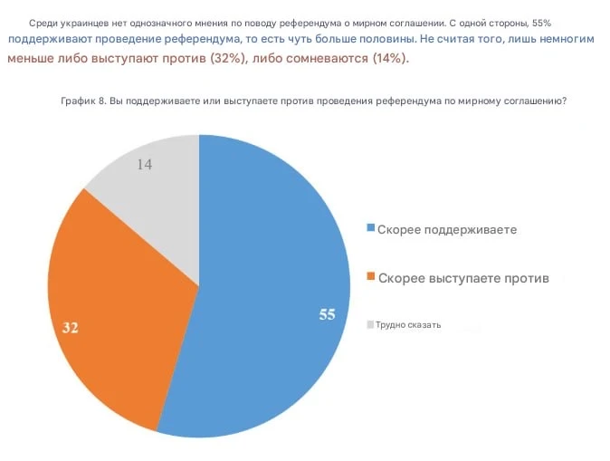 ⚡️55% украинцев поддерживают референдум по мирному соглашению с Россией, 32% выступают против.