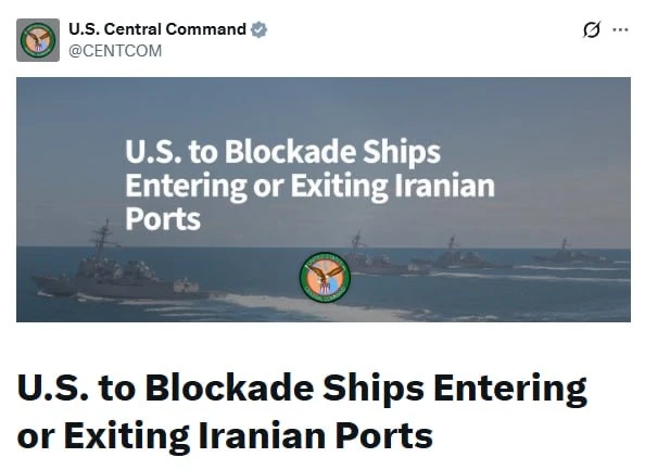 ⚡️США начнут осуществление блокады всего морского трафика, входящего и выходящего из иранских портов, 13 апреля в 17:00 МСК, — Центральное командование ВС США.