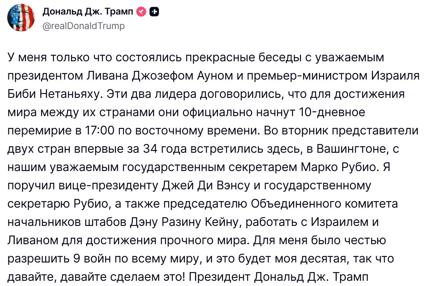 Ливан и Израиль договорились о достижения мира. Они официально объявят 10-дневное перемирие в 17:00 по восточному стандартному времени.