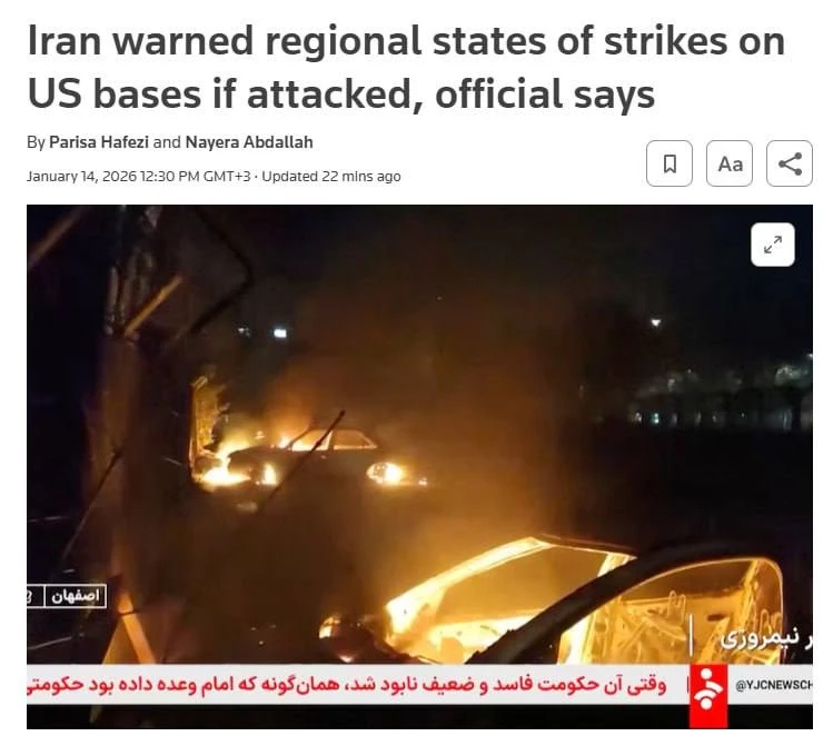 ⚡️Иран предупредил союзников США на Ближнем Востоке, что нанесет удар по американским базам на их территории, если США нападут на Иран, — Reuters.