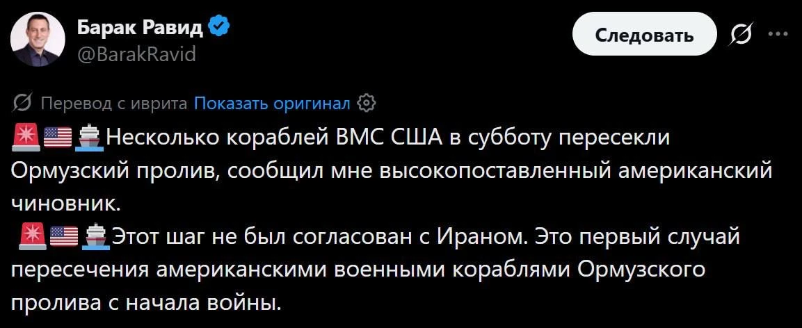 ⚡️Несколько кораблей ВМС США сегодня пересекли Ормузский пролив, — журналист Axios Барак Равид.