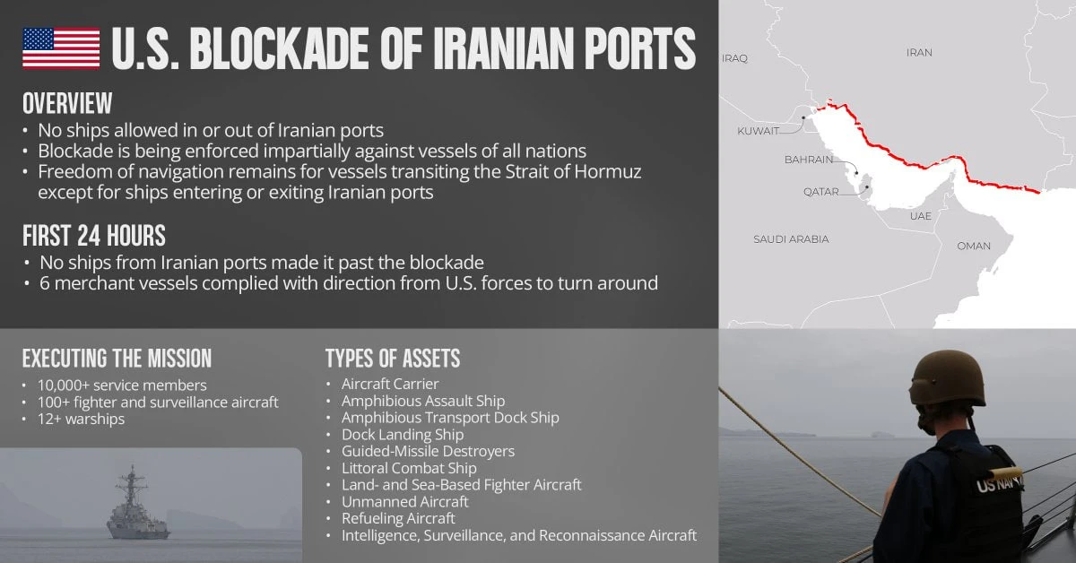 «Блокада будет применяться без исключений ко всем судам любых стран, заходящим в иранские порты или покидающим их прибрежные районы, включая все иранские порты в Персидском заливе и Оманском заливе. При этом силы CENTCOM не будут препятствовать свободе судоходства для судов, проходящих через Ормузский пролив в/из портов, не относящихся к Ирану».