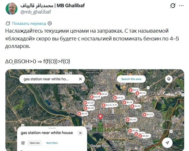⚡️Наслаждайтесь текущими ценами на заправках. С так называемой «блокадой» скоро вы будете с ностальгией вспоминать бензин по 4–5 долларов, — спикер иранского парламента Галибаф.