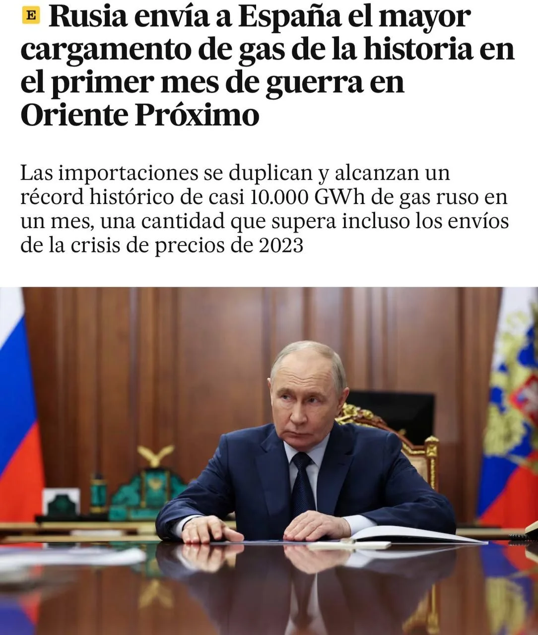 ⚡️Россия отправила в Испанию рекордный объём газа в первый месяц войны на Ближнем Востоке, — El Pais.