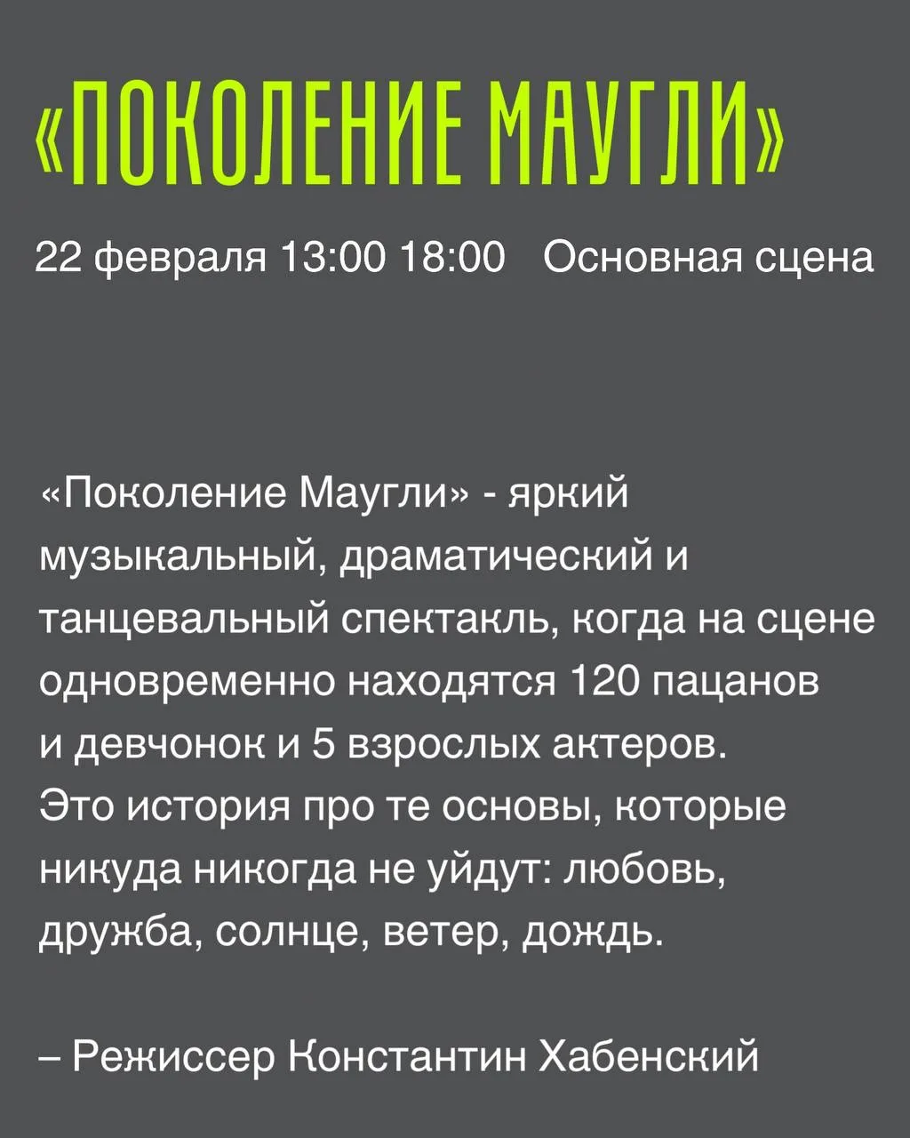 🌀 22 февраля в 13:00 и 18:00 – «Поколение Маугли», режиссер Константин Хабенский.