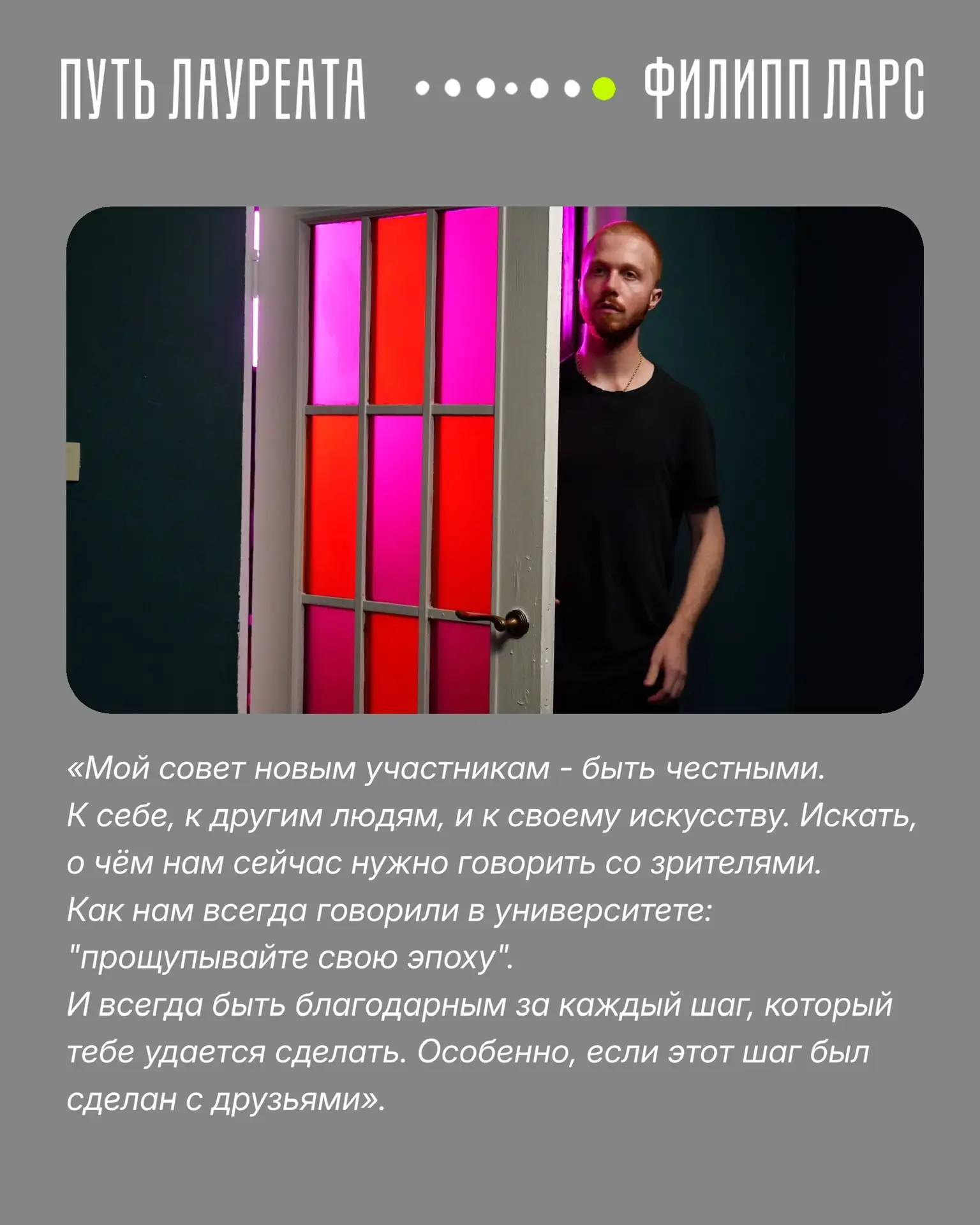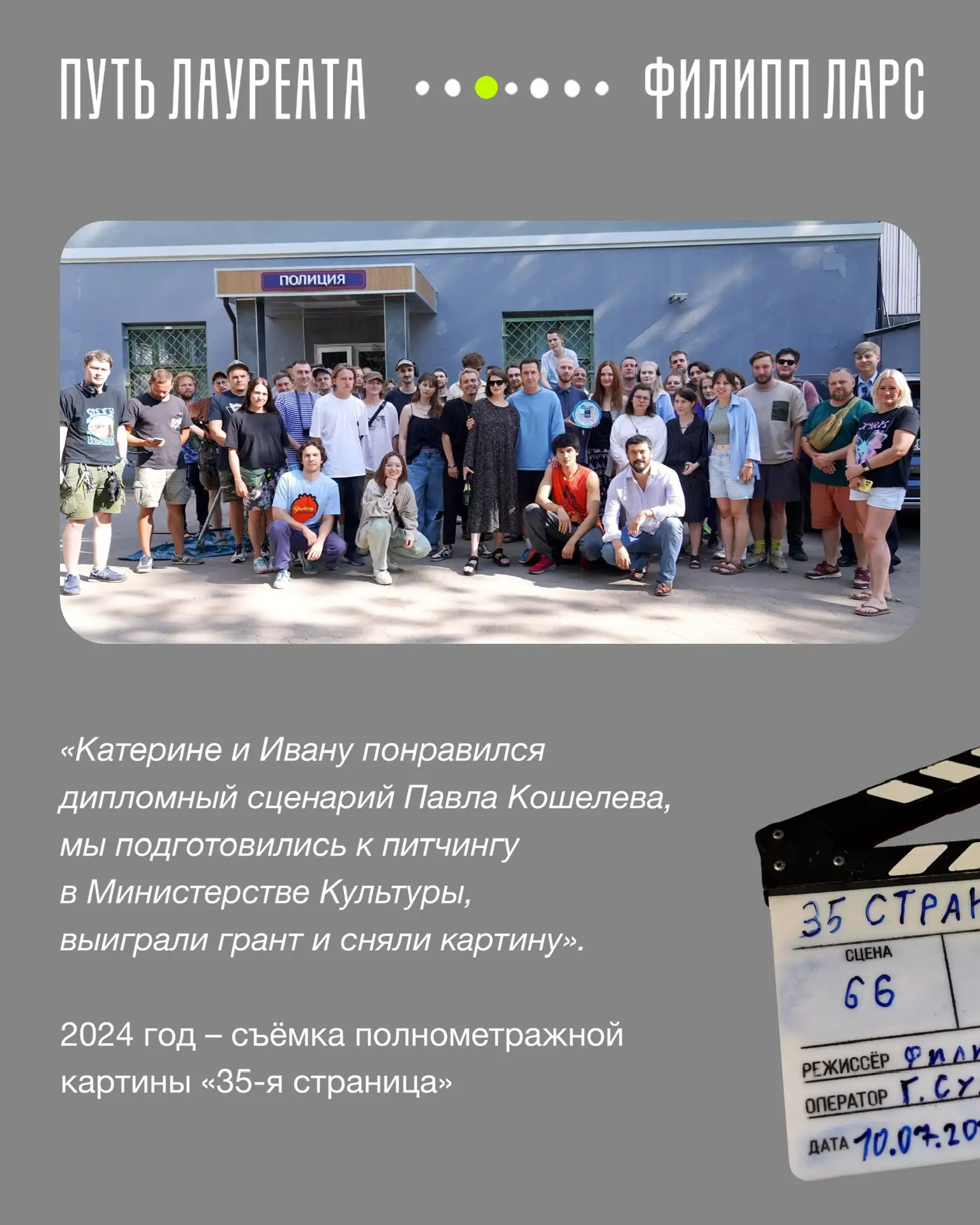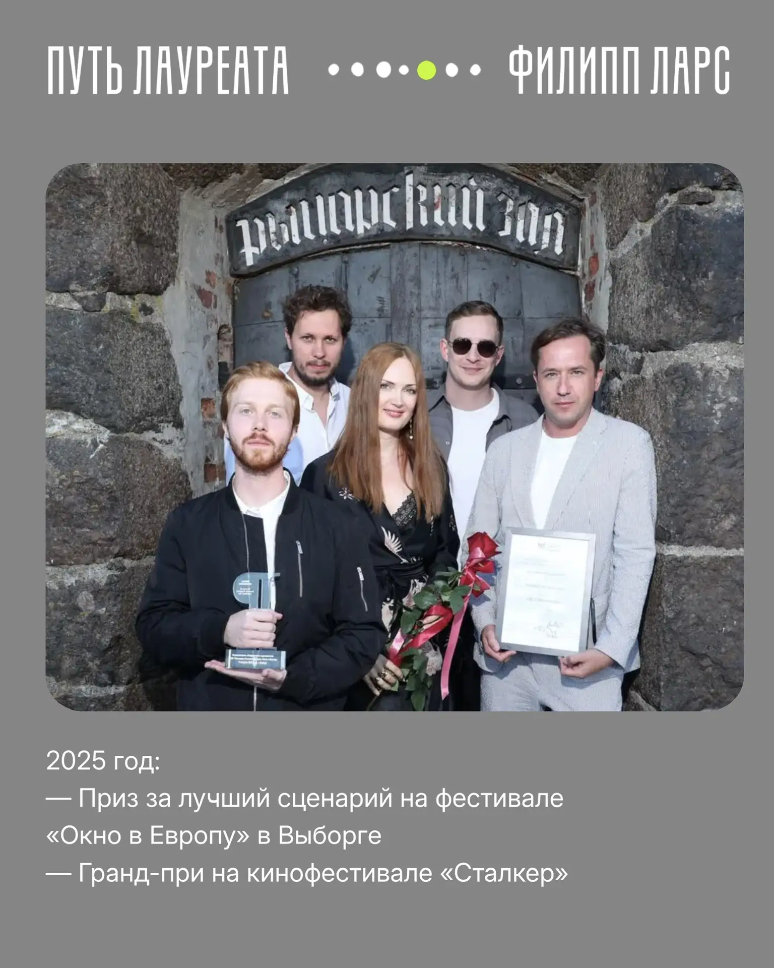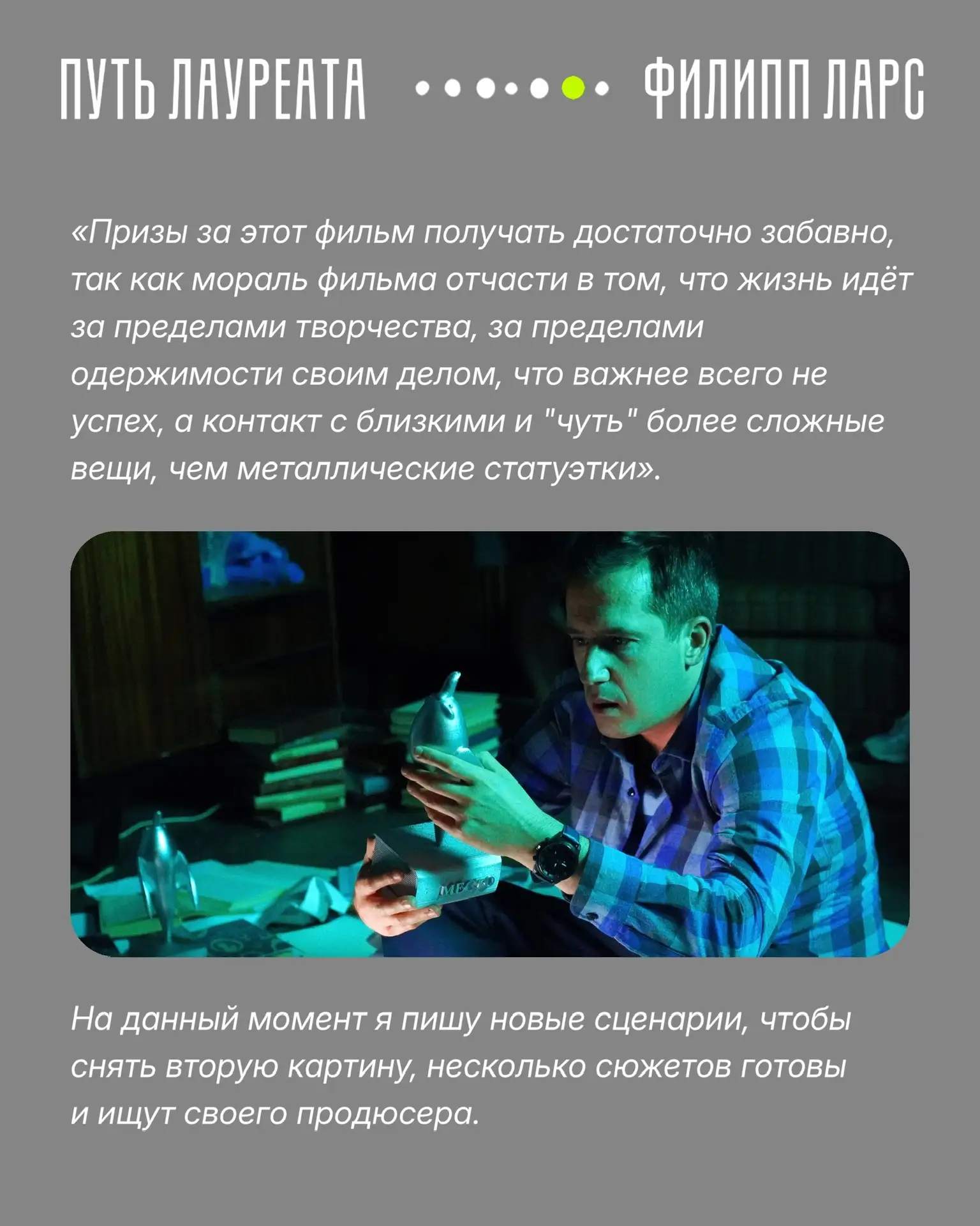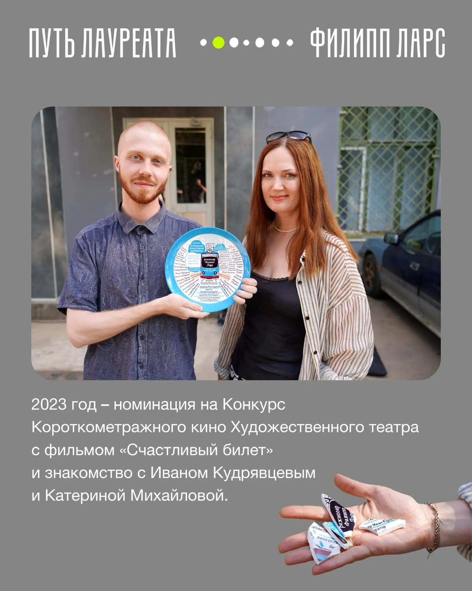 В карточках – рассказ номинанта 2023 года Филиппа Ларса. Его конкурсный фильм «Счастливый билет» смотрите на Wink.ru.