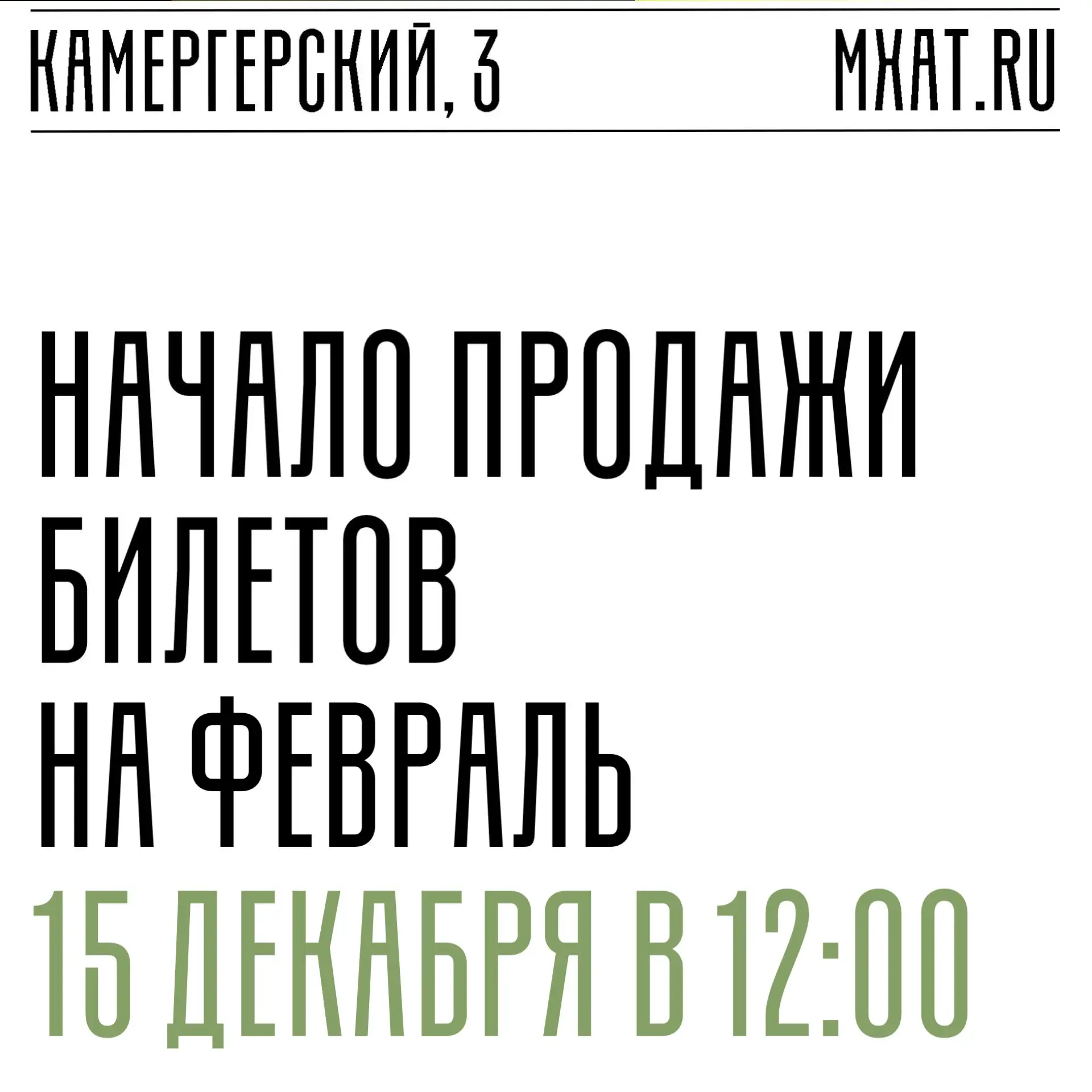 🌀 Продажа билетов на февраль в кассах МХТ и на сайте театра начнётся 15 декабря в 12:00. С 15:00 можно будет забронировать билеты по телефонам (495) 646-3-646 и (495) 692-67-48.