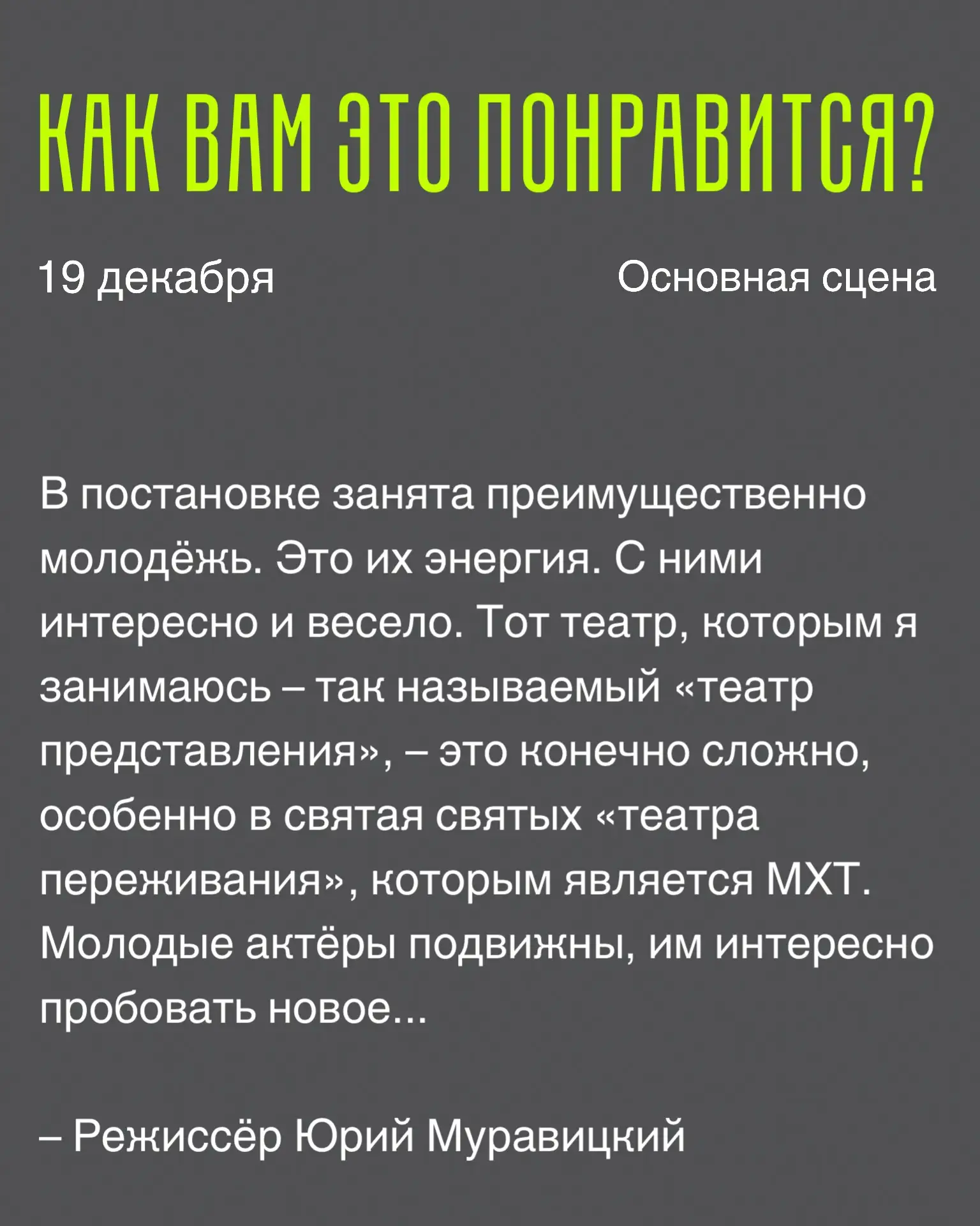 🟢 19 декабря – «Как вам это понравится?», режиссер Юрий Муравицкий.