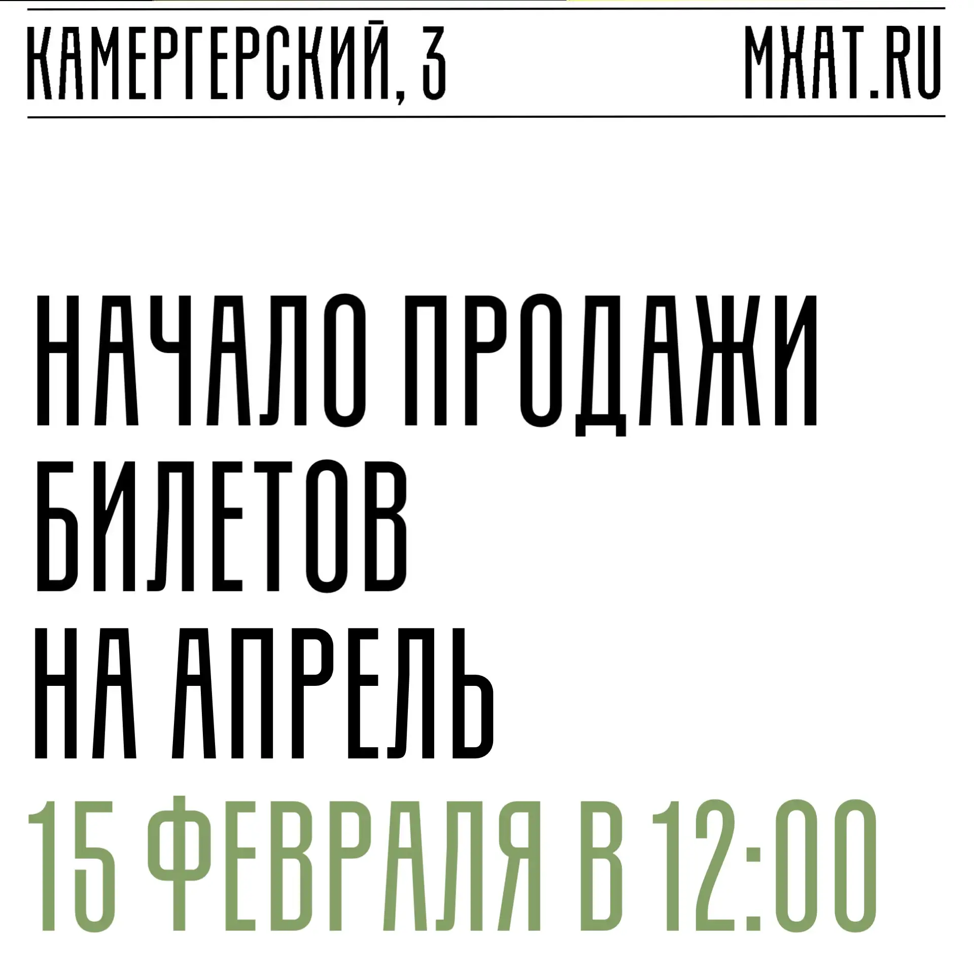 Стоимость билетов, приобретённых на сайте МХТ, будет автоматически возвращена на карты, с которых производилась оплата. Билеты, купленные в кассах театра и у наших официальных партнёров, подлежат возврату по месту покупки в срок по 3 апреля включительно. Приносим извинения за доставленные неудобства!