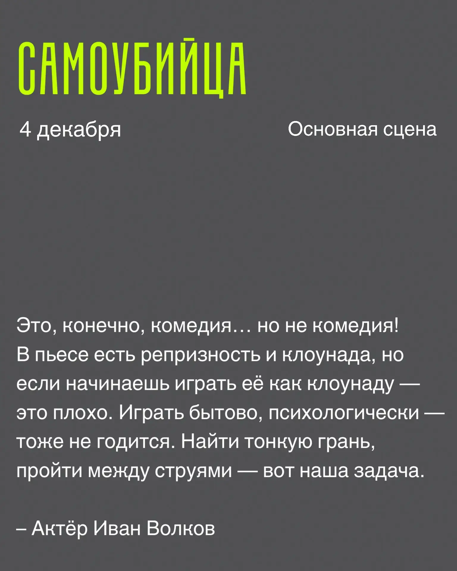 13 ноября, 4 декабря на Основной сцене МХТ – «Самоубийца» Николая Рощина. Билеты: vk.cc/cOIIGl
