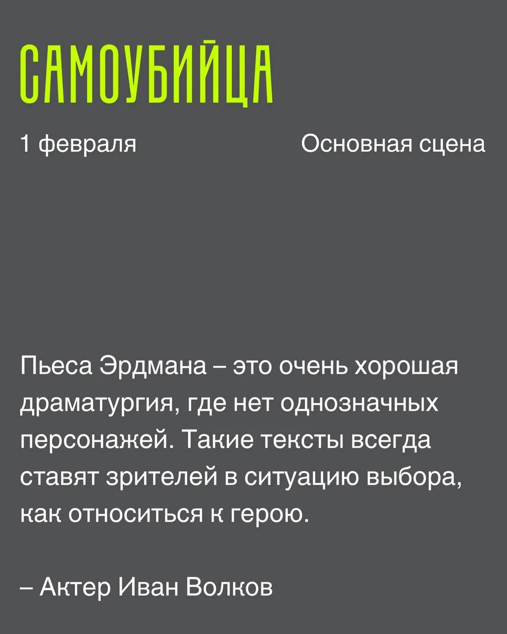 🌀 1 февраля – «Самоубийца», режиссер Николай Рощин.