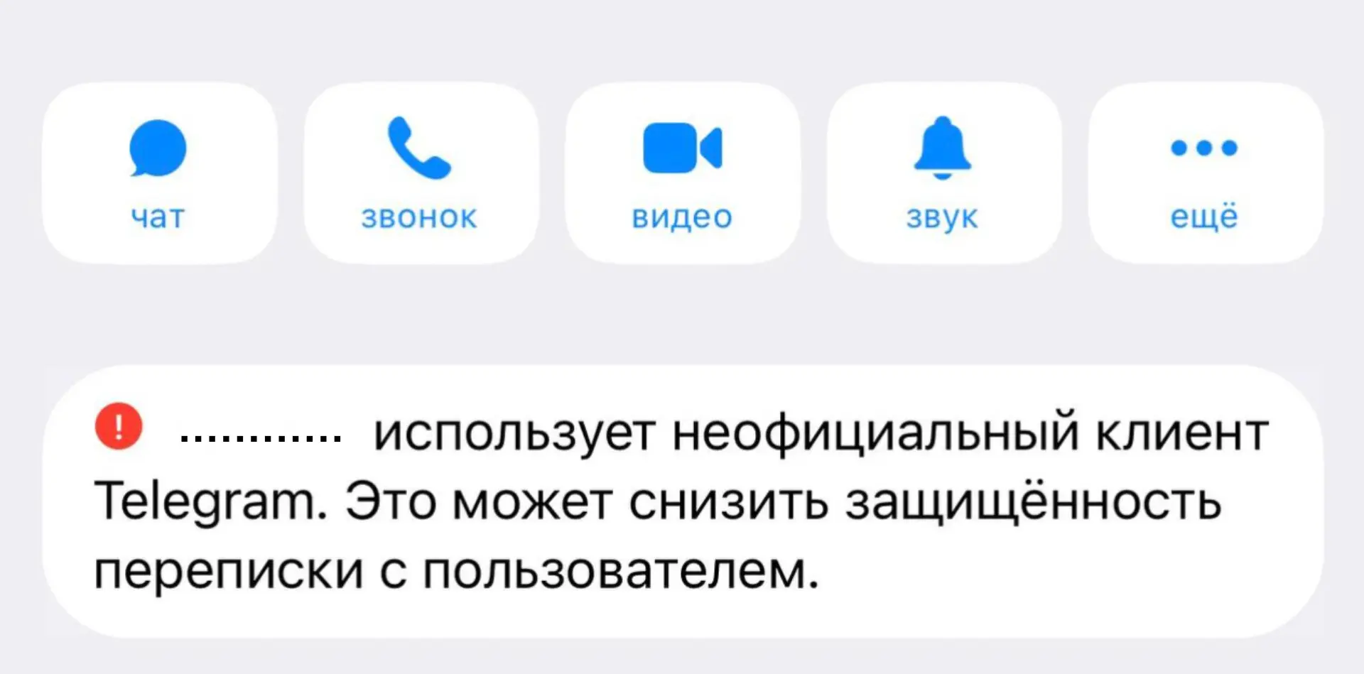 Telegram установил отметку предупреждение всем юзерам, кто использует сторонний клиент и «зеркала», например «телега». В описании профиля начало появляться уведомление о низкой защищённости.