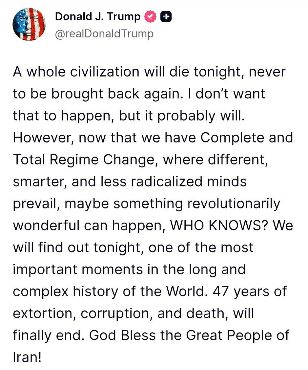 "Вторник будет днем электростанций и днем мостов - все в одном - в Иране. Подобного этому не было ничего! Откройте ё... пролив, вы безумные ублюдки, иначе будете жить в аду. Сами увидите!"