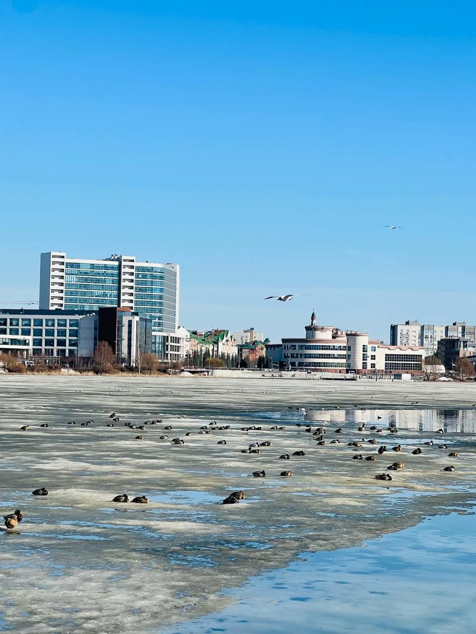 А вот утки не торопятся покидать последние льдинки и сидят на них, будто на лучших местах с видом на озеро.