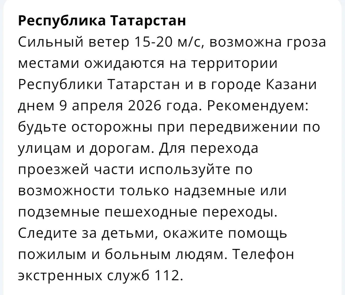 ❗️ Завтра в Татарстане ожидается ухудшение погоды — ветер до 15–20 м/с и возможная гроза.