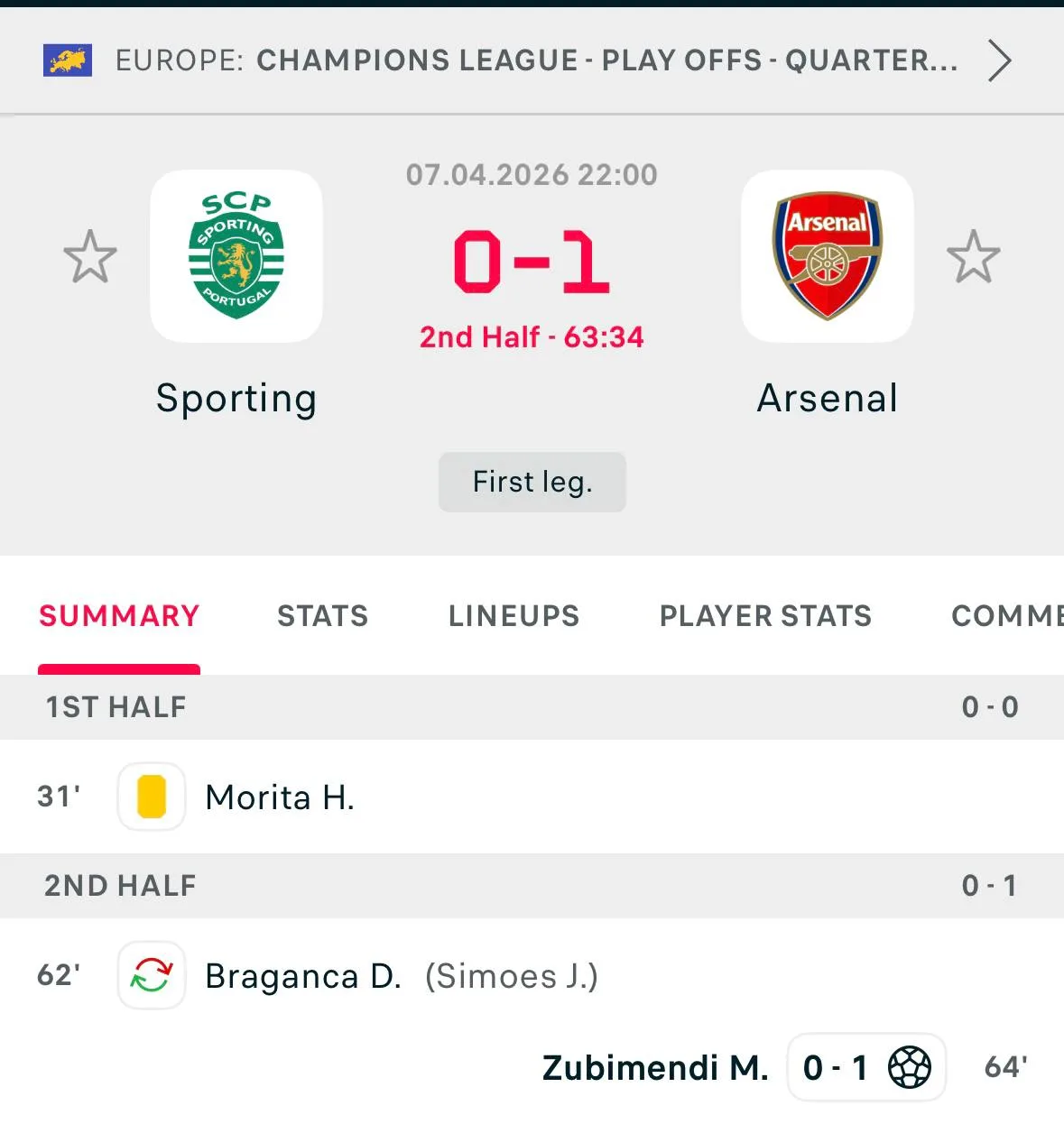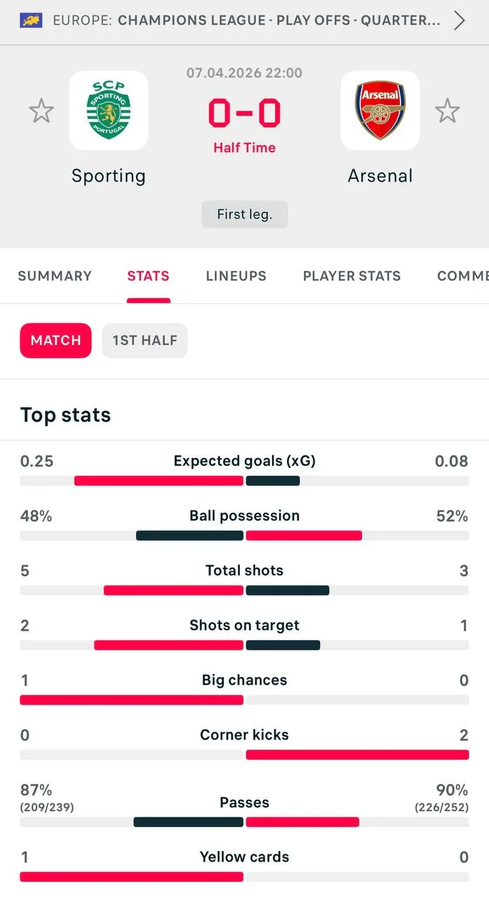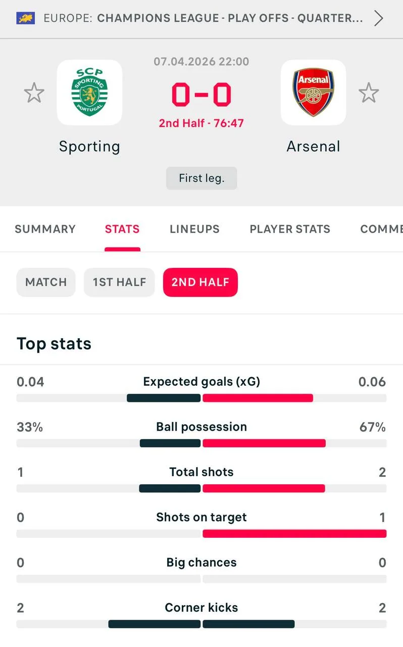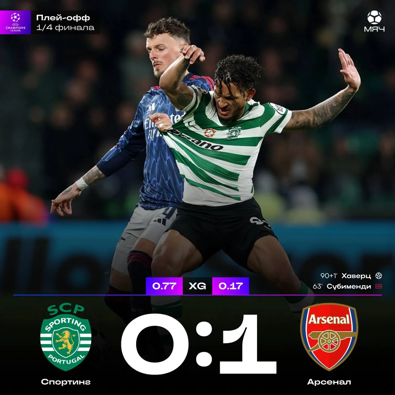 В первом матче 1/4 «Арсенал» катал 0:0 со «Спортингом», имея меньше xG (0,77 vs 0,17). Но Хаверц забил на 90+1’ (1:0).