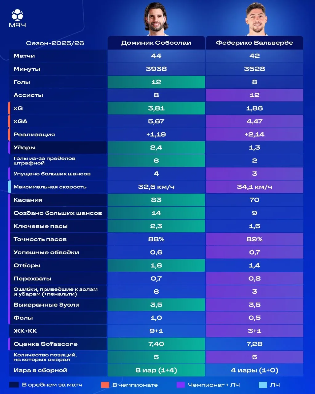 Доминик чаще встречается с мячом, бьет, больше креативит (xG, xGA, созданные шансы) и лучше выступает за сборную. Феде отвечает лучшей реализацией, большим оборонительным вкладом и минимумом ошибок.