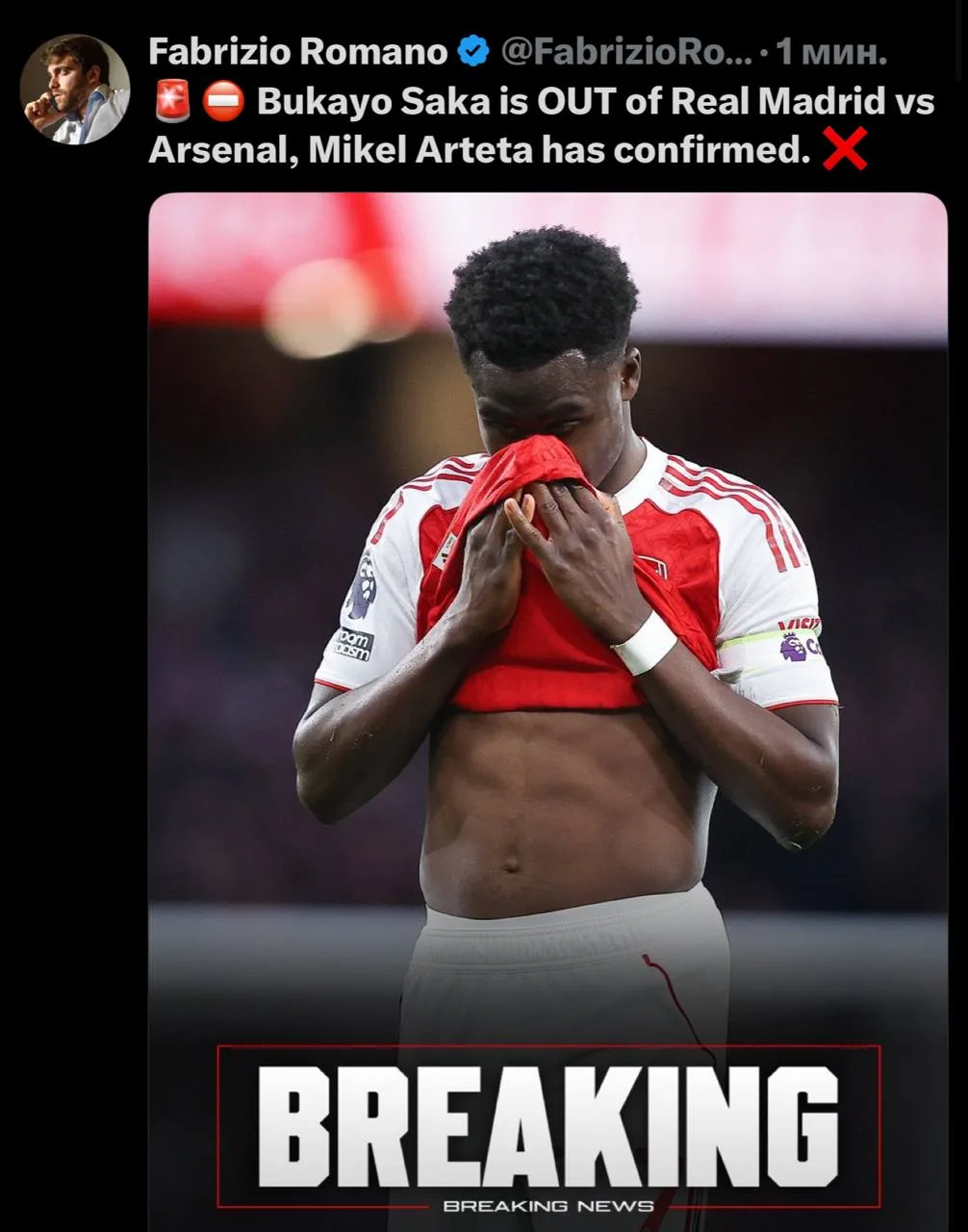 Только что Фабрицио Романо сообщил, что Букайо Сака пропустит матч между «Арсеналом» и «Реалом».