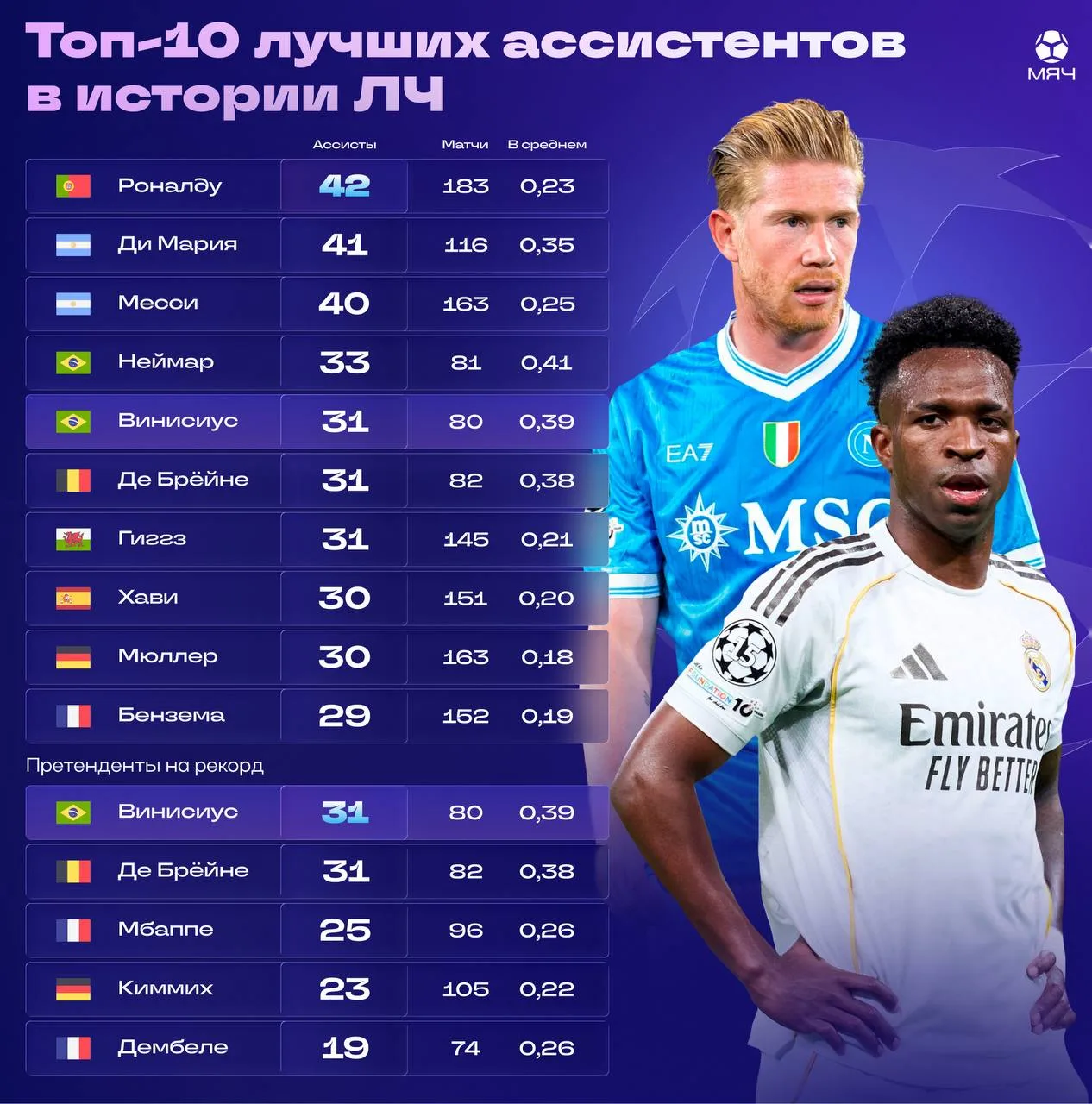 🇧🇷 Винисиус уже 5-й ассистент в истории ЛЧ. Когда станет 1-м?