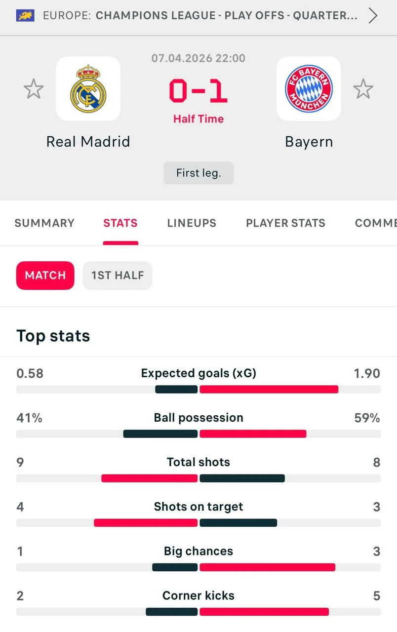📉 Статистика «Реала» и «Баварии» после первого тайма!
