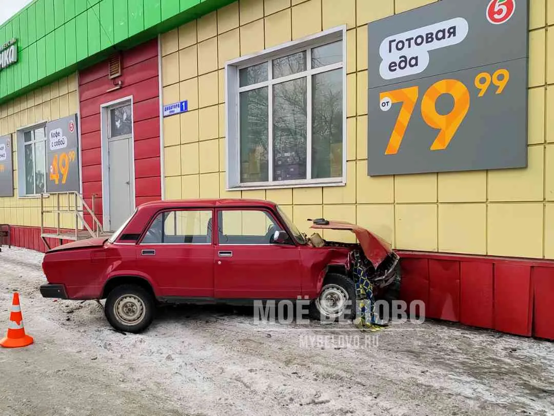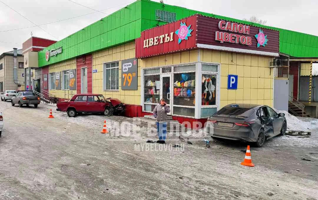 Автомобиль «Жигули» двигаясь со стороны центра города, не вписался в поворот, подскочил на сугробе, протаранил Тойоту Камри, Ладу Приору и врезался в стену магазина Пятерочка.