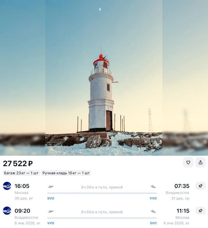 У Аэрофлота билеты на прямые рейсы из Москвы во Владивосток в топ-даты всего за 27 520 ₽ туда-обратно