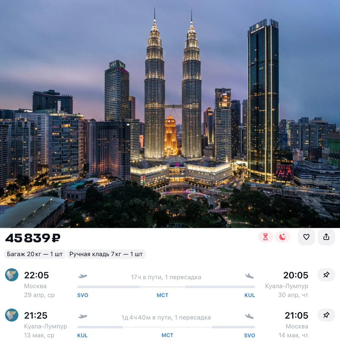 Билеты из Москвы с вылетом 29 апреля в Куала-Лумпур, пересадки в Маскате, багаж включен, всего за 45 839 ₽ туда-обратно!