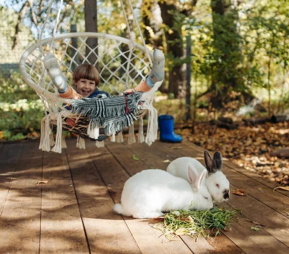 В глэмпинге живут ручные кролики, есть лодки, sup-сёрфинг и бадминтон.