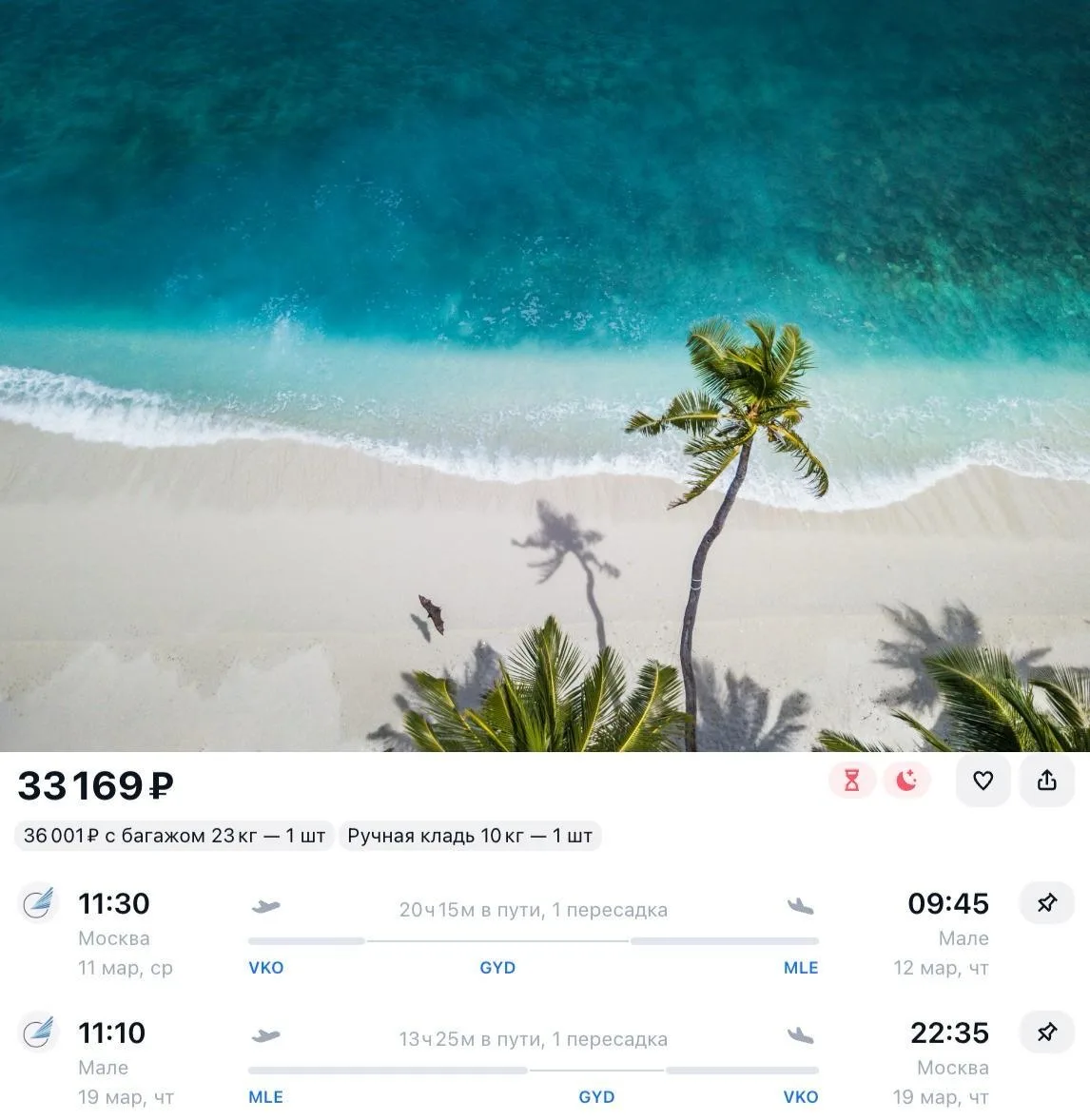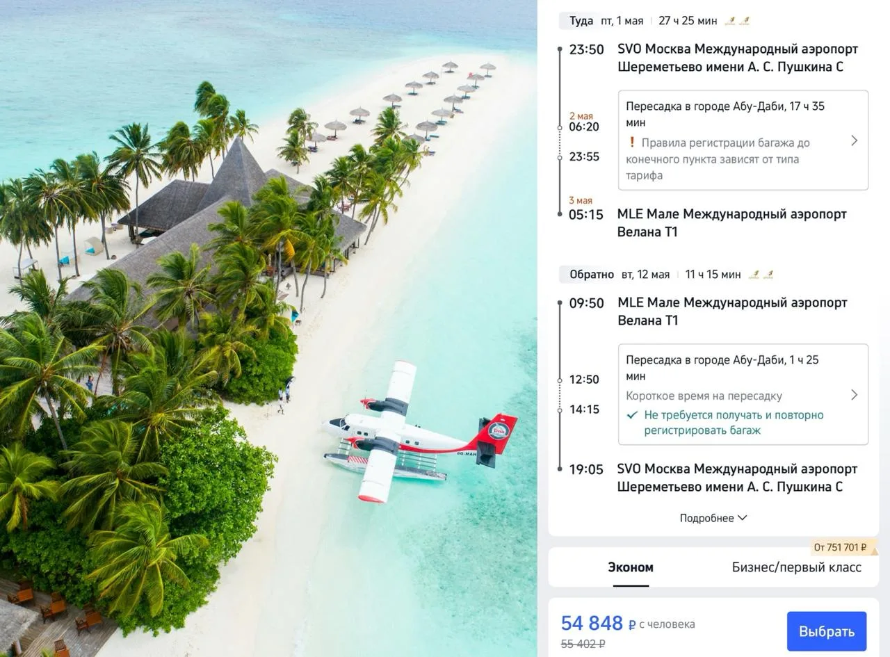 Летим из Москвы на все майские с 1 по 12 мая на Мальдивы с пересадками в Абу-Даби всего за 54 905 ₽ туда-обратно