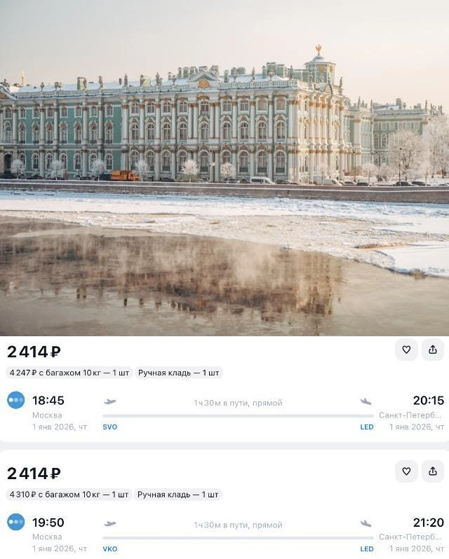 1 января вечером можно улететь из Москвы в Петербург «Победой» всего за 2 414 ₽ в одну сторону!