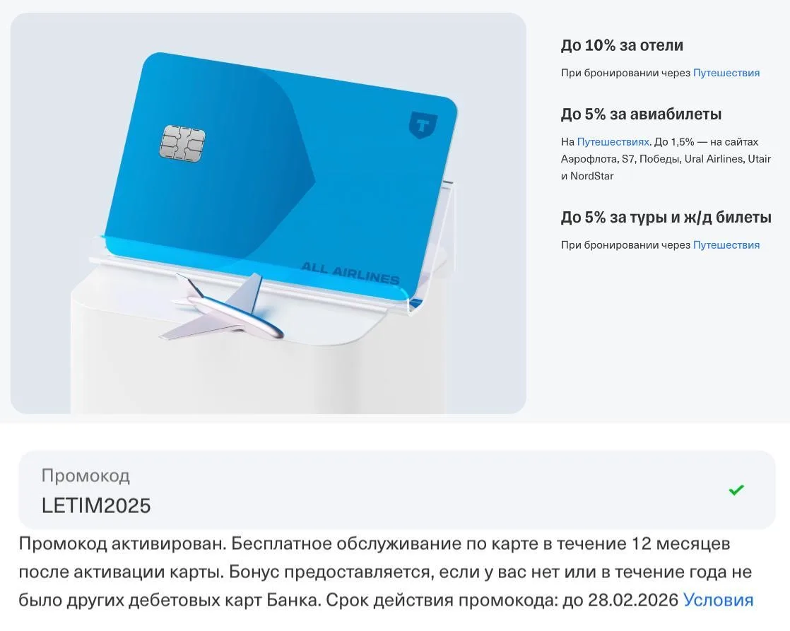 У Т-Банка промокод LETIM2025 на оформление банковской дебетовой карты для путешествий All Airlines с годом бесплатного обслуживания!