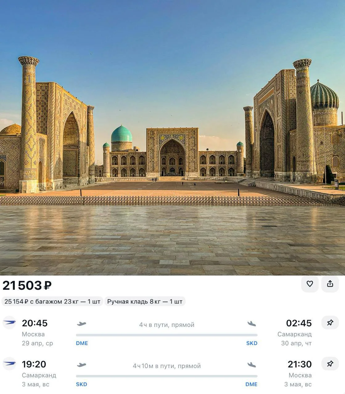 Хорошая цена полететь на первые майские в Узбекистан в Самарканд!