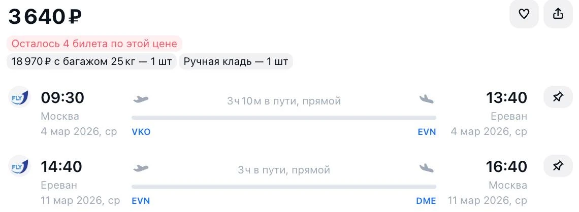 Москва - Ереван в марте всего за 3 640 ₽ туда-обратно: https://avs.io/68tcO