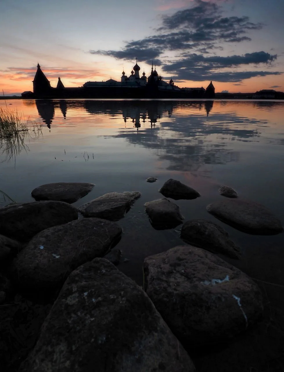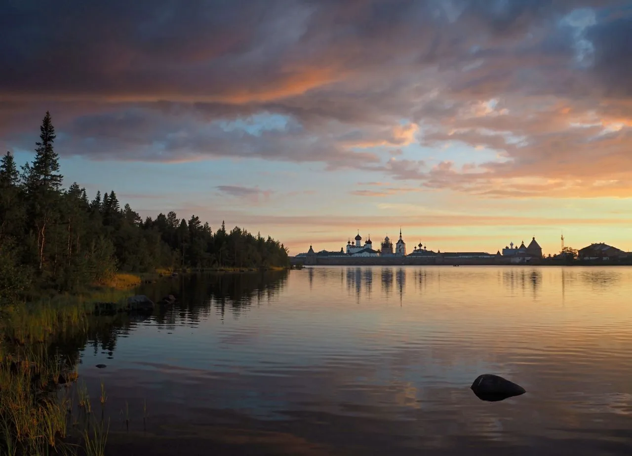 Есть в летних соловецких закатах что-то волшебное и вечное. Воздух наполнен тишиной, а солнце, нехотя уходя за горизонт, заливает небо и воду красками невероятной мягкости. Кажется, вот он — момент настоящей гармонии и умиротворения.