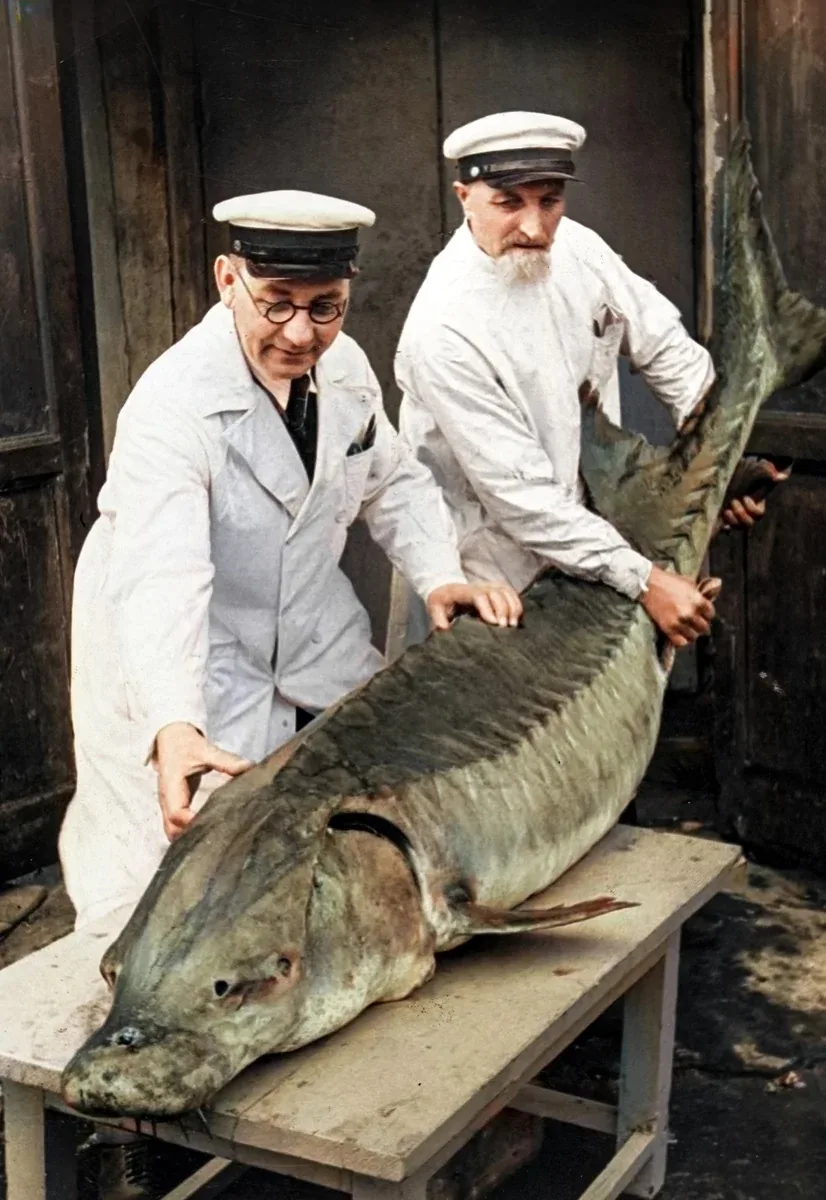 Перед вами не просто фото, а цветная машина времени, которая переносит нас в 1930-е годы. На снимке — невероятный улов из Сестрорецка: атлантический осётр весом почти в 135 килограммов! С ним с любопытством знакомятся рабочие Ленинградского рыбоперерабатывающего завода.