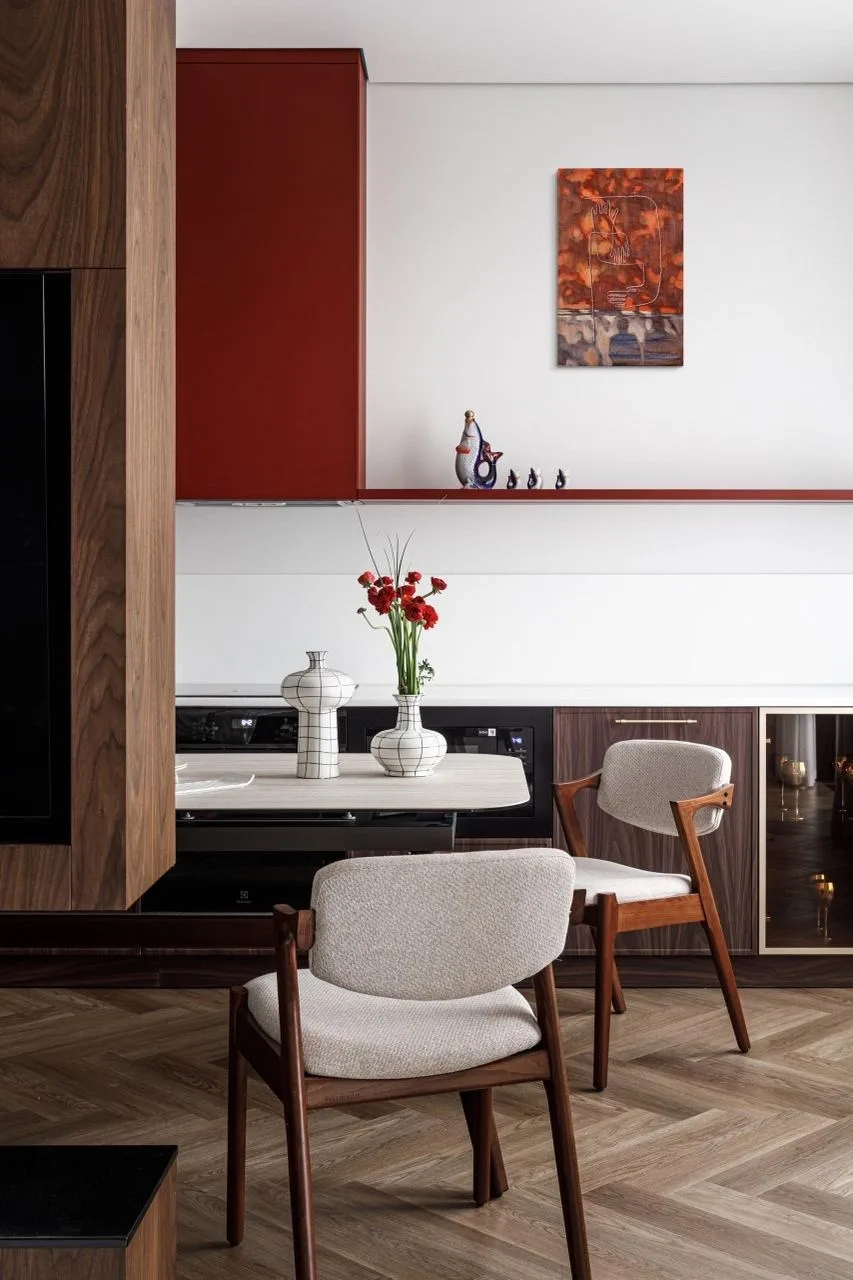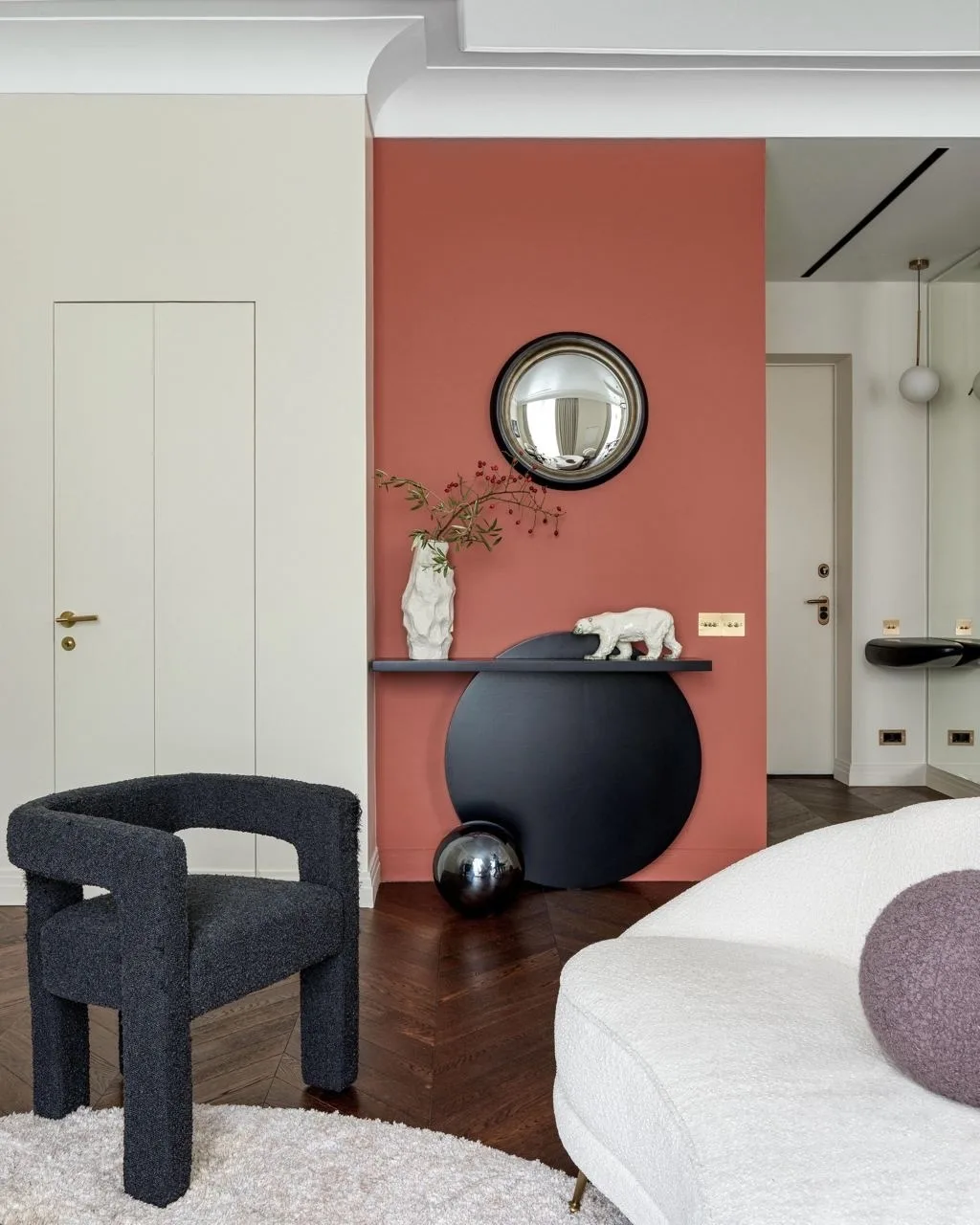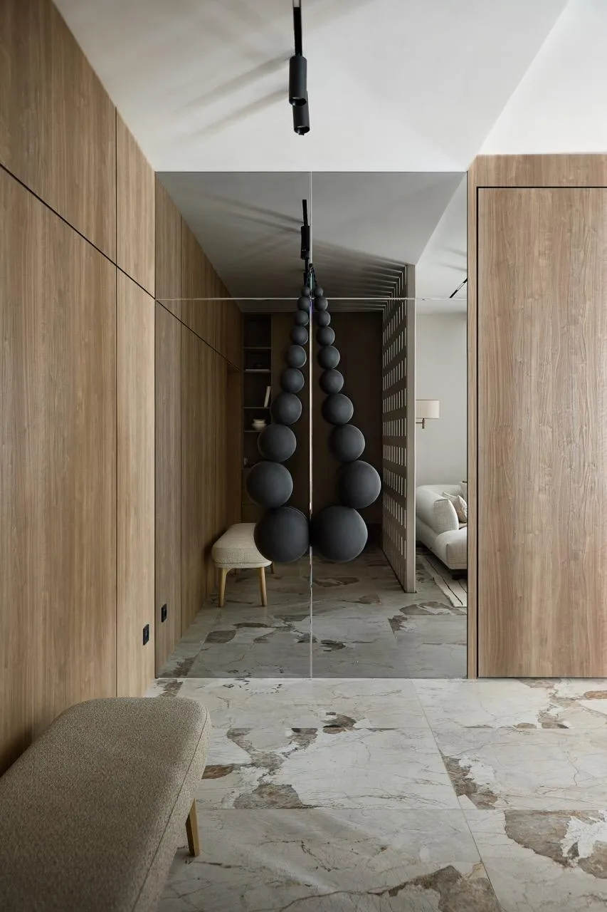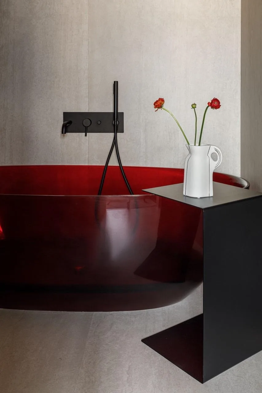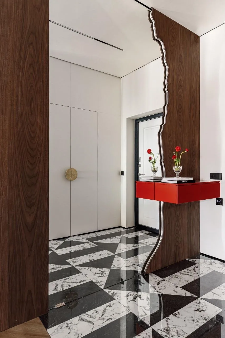 Цветовая гамма квартиры строится на игре противоположностей. Архитекторы называют это «дуальностью» — своеобразным перетягиванием каната между спокойствием и драматической насыщенностью. Основу составляют мягкие, светлые нейтральные тона, которые неожиданно прерываются яркими цветовыми акцентами.